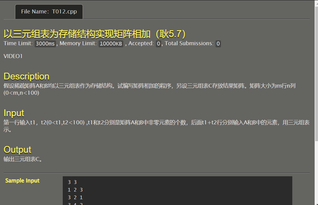 以三元组为存储结构实现矩阵相加(NOJ理论第12题)