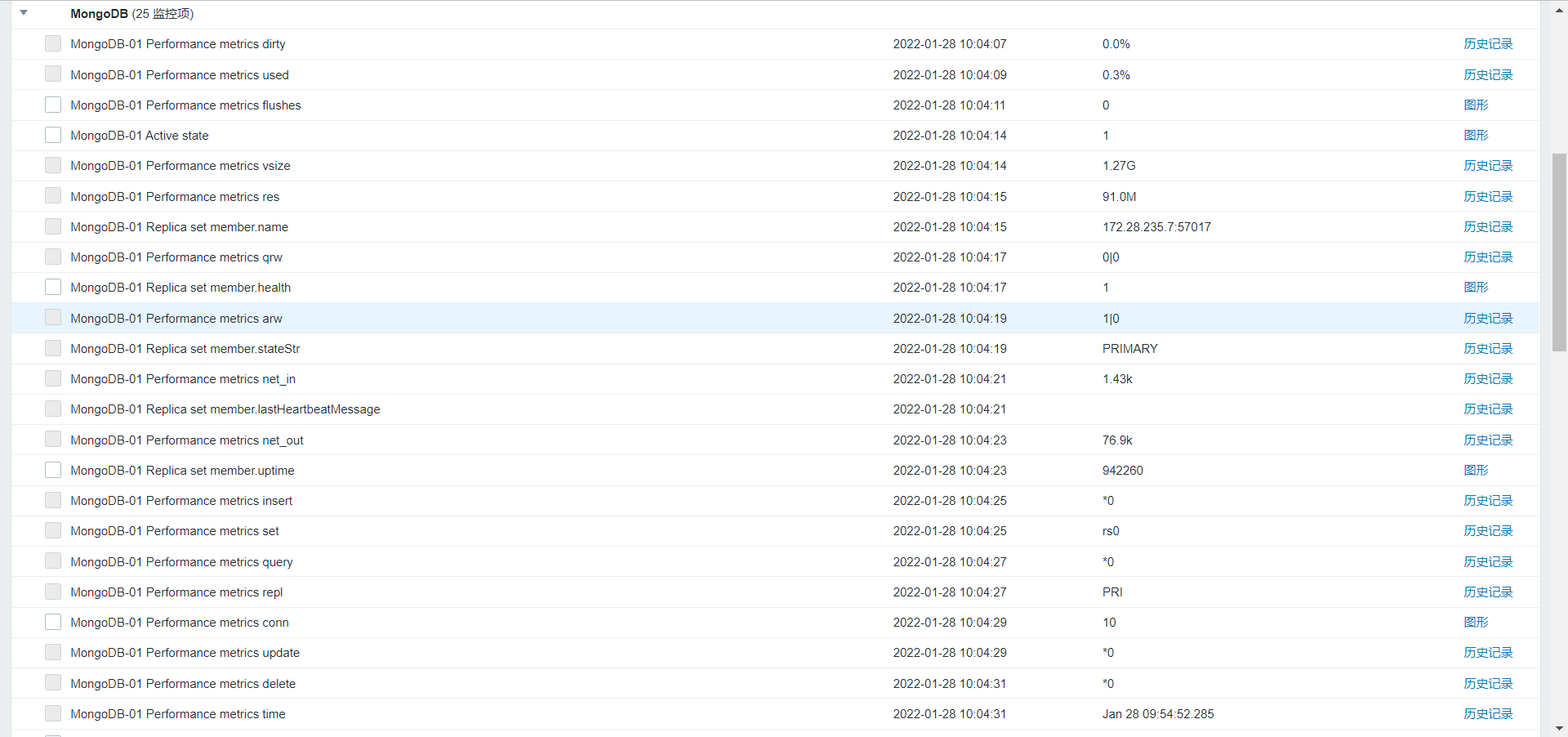 使用mongostat和"echo rs.status()["members"][<成员ID>]|mongo"命令获取到副本集状态和性能指标,将执行的结果缓存到本地,每间隔10分钟将刷新一次缓存!