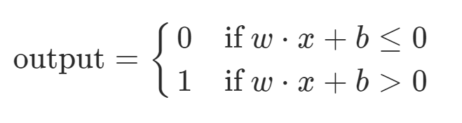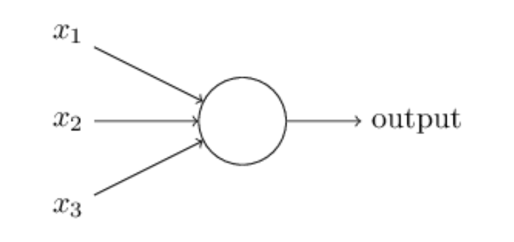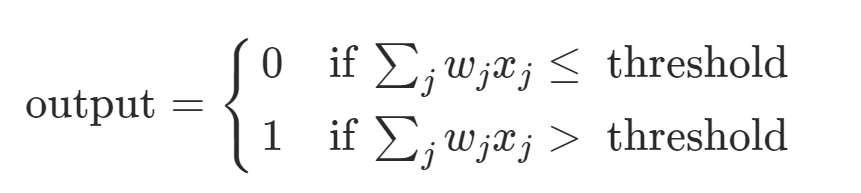 工作原理:接受一系列0/1输入,输出单个0/1。对于每个输入xi,设置有其所对应的权重wi。当∑xiwi ≥ threshold时输出1,反之为0。
