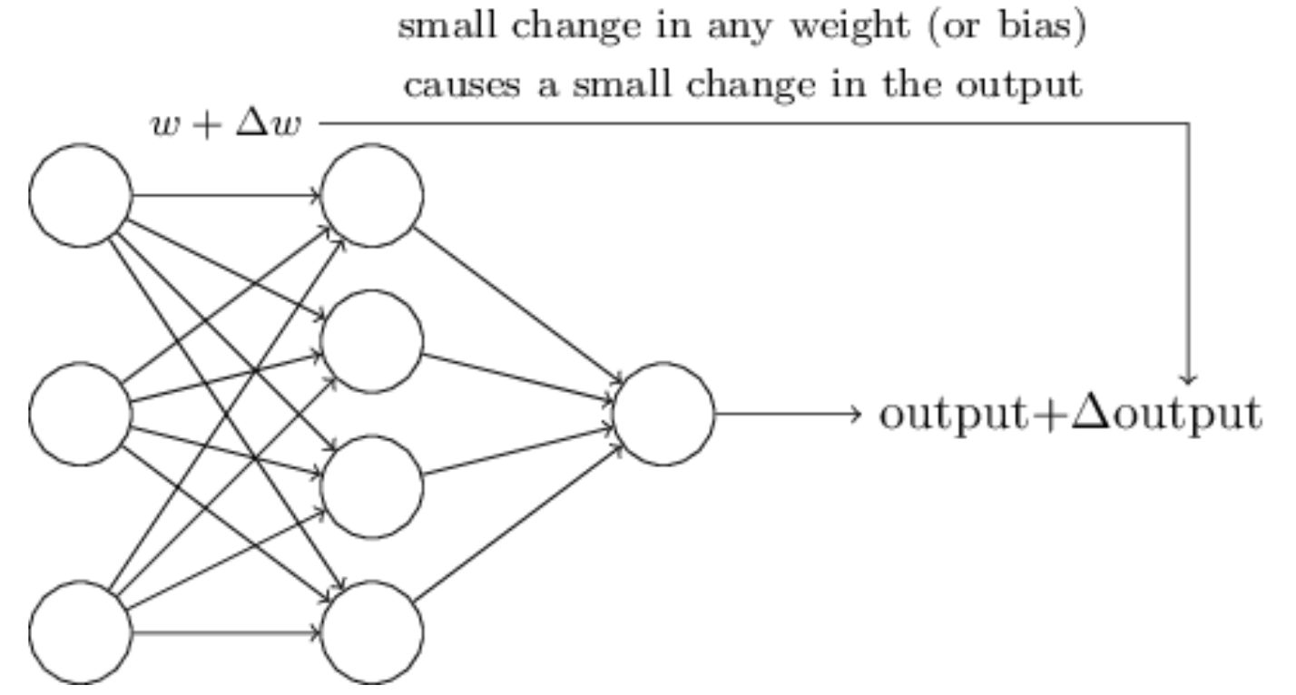 对于学习算法,例如一个识别手写文字图片的算法,假如原网络错误的将“8”识别成“9”,我们希望学习算法能够通过调整weight,来使网络能正确识别。但是这并不会在包含perceptron的网络中发生。对weight的微小改动会造成整个网络的变化。可能对8/9的识别改进,会导致其他数字识别效果的下降。