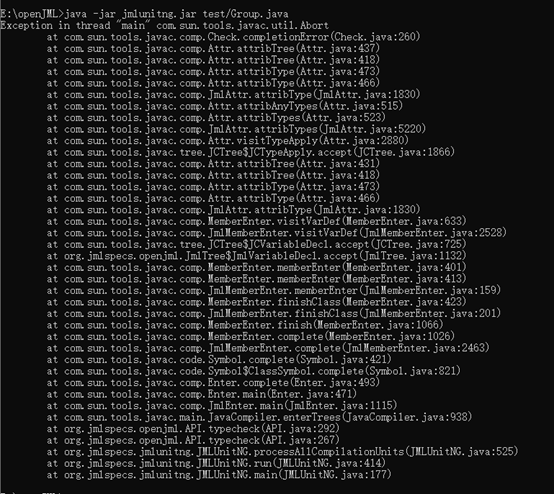第一条指令主要是生成测试用例,第二条则是对生成的java文件进行编译。在处理第一条指令的时候,我就遇到了很多问题,主要的问题就是在Group种无法找到Person类,然后报出看不懂的异常: