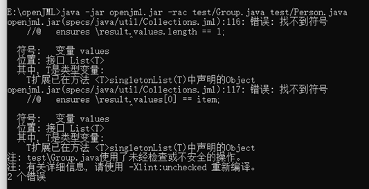 分析可知大概是Collections出了问题,但我并不知道问题出在哪里,我猜测可能是OpenJML不支持Collections导致的,所以我删去了Group类中用到的关于collection的地方,果然没有再报错。