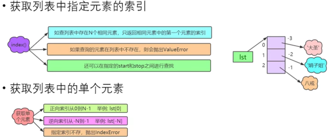 1).获取指定元素的索引 2).获取列表中指定元素 3).获取列表中的多个元素