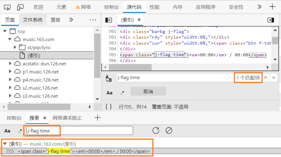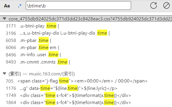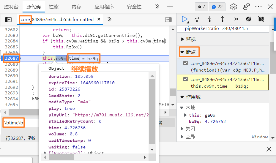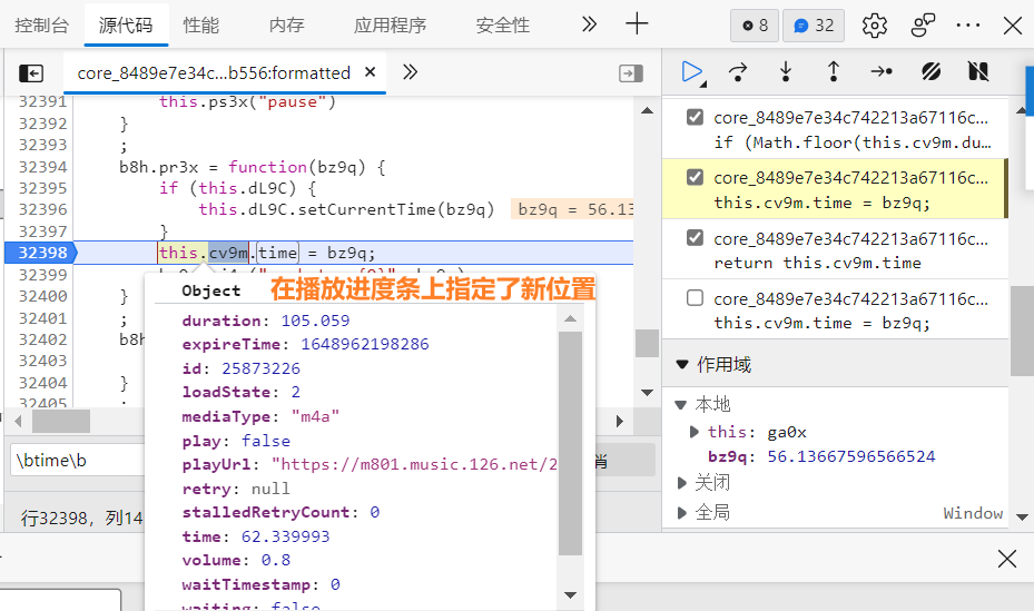 逐一查看搜索结果,找到设置time(赋值)操作,打断点,并播放(运行)、在进度条上指定新位置以查看运行时值,代码与前端界面对应。![]()