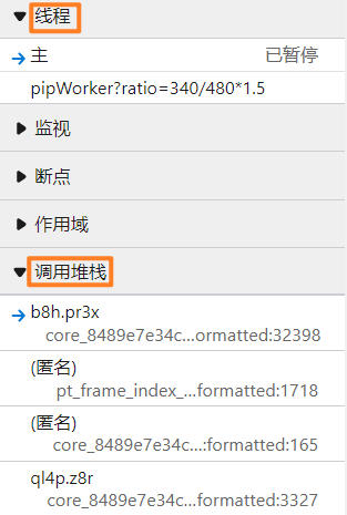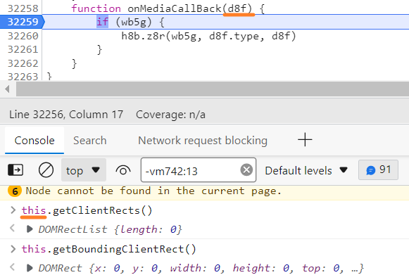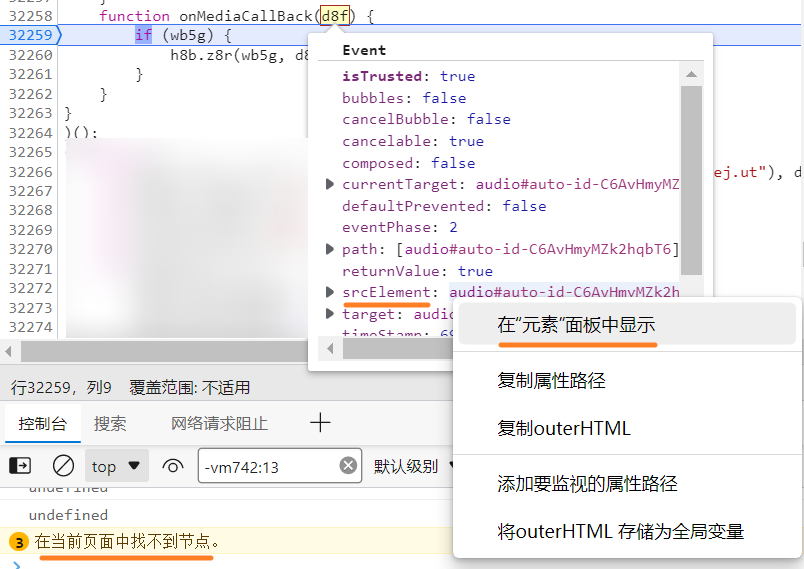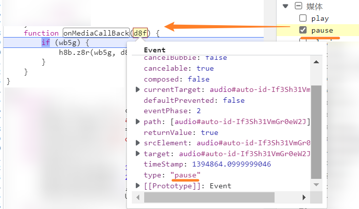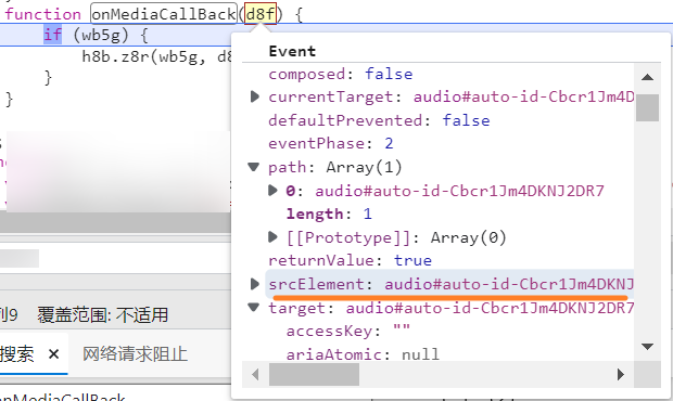 栈中向上在栈顶!找到onMediaCallBack。函数名没有被简化/混淆,且定义无let/var限定,说明是DOM全局的?