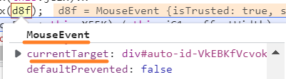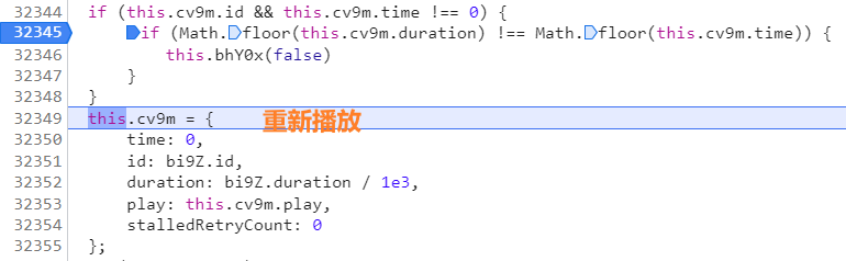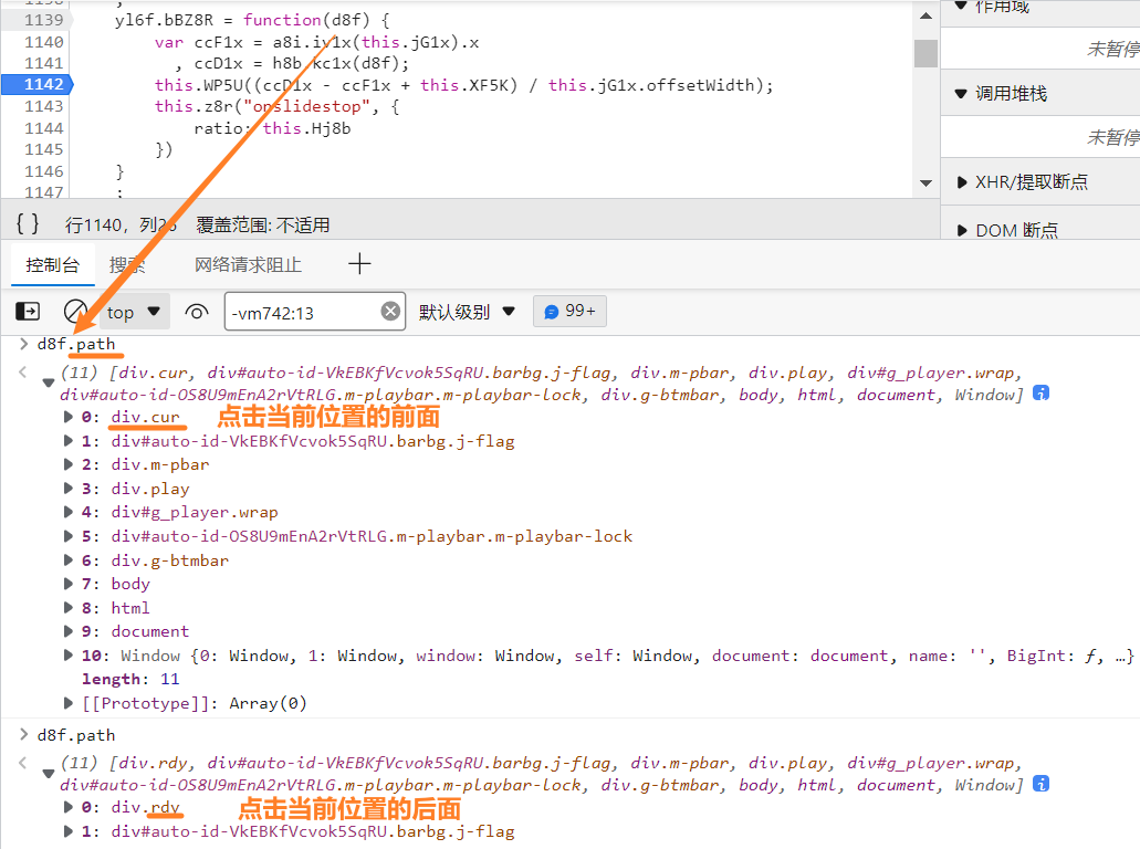 - 手动点击播放进度条,找到来自DOM元素触发的事件(d8f)响应。注意触发元素是currentTarget(而非path[0])