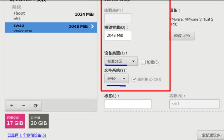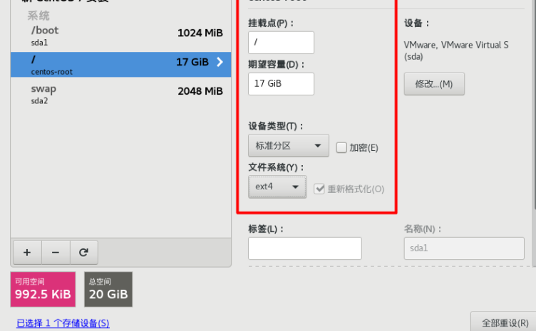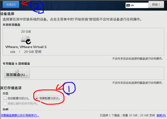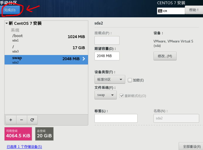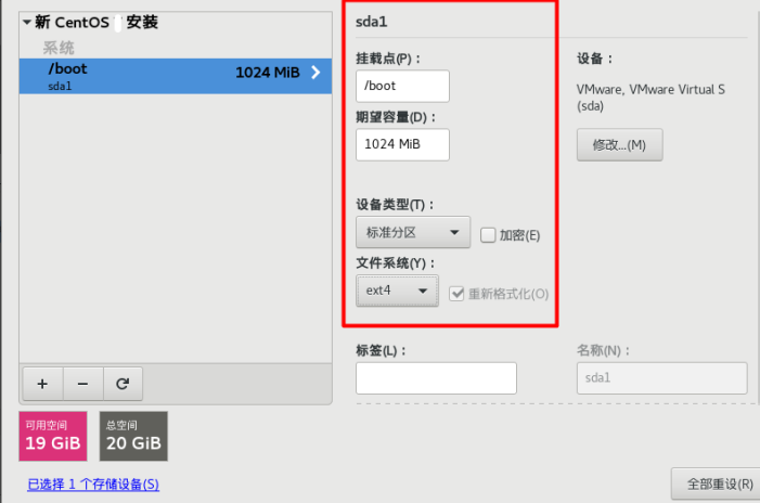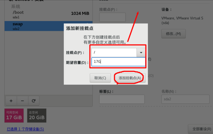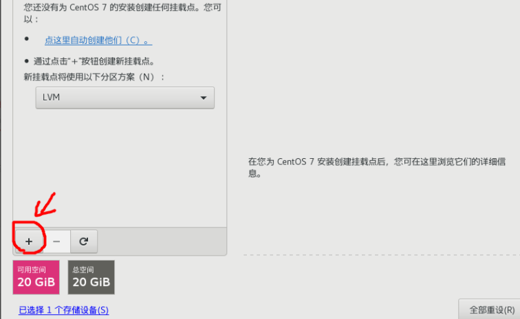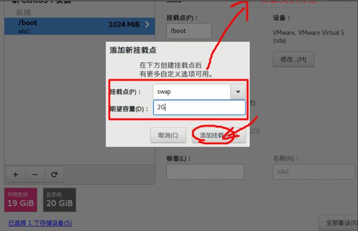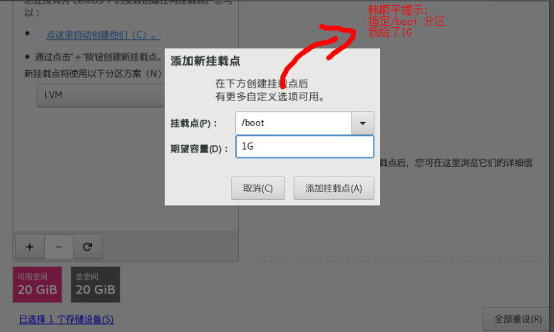 先指定/boot 分区,即引导分区,大小为1G, 然后点击添加挂载点.