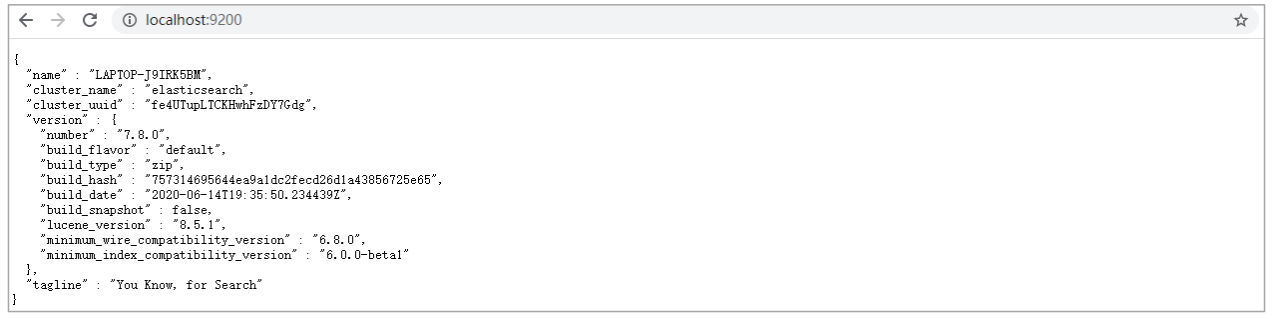 打开浏览器(推荐使用谷歌浏览器),输入地址:http://localhost:9200,测试结果