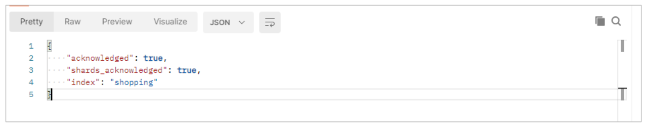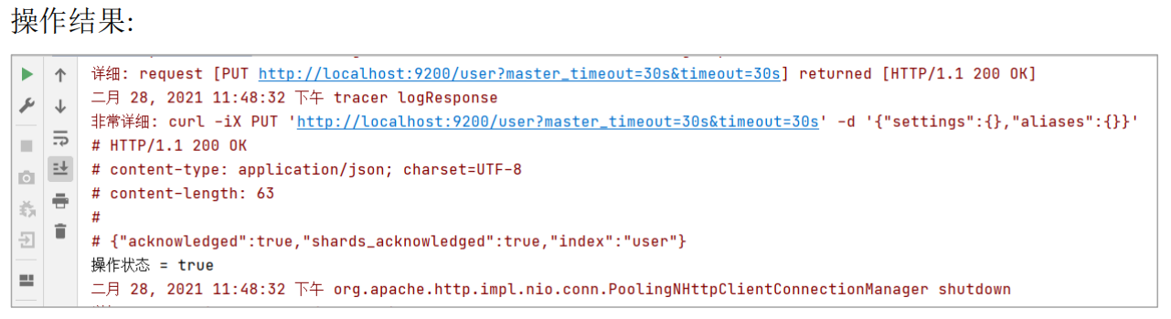 // 创建索引 - 请求对象 CreateIndexRequest request = new CreateIndexRequest("user"); // 发送请求,获取响应 CreateIndexResponse response = client.indices().create(request, RequestOptions.DEFAULT); boolean acknowledged = response.isAcknowledged(); // 响应状态 System.out.println("操作状态 = " + acknowledged);