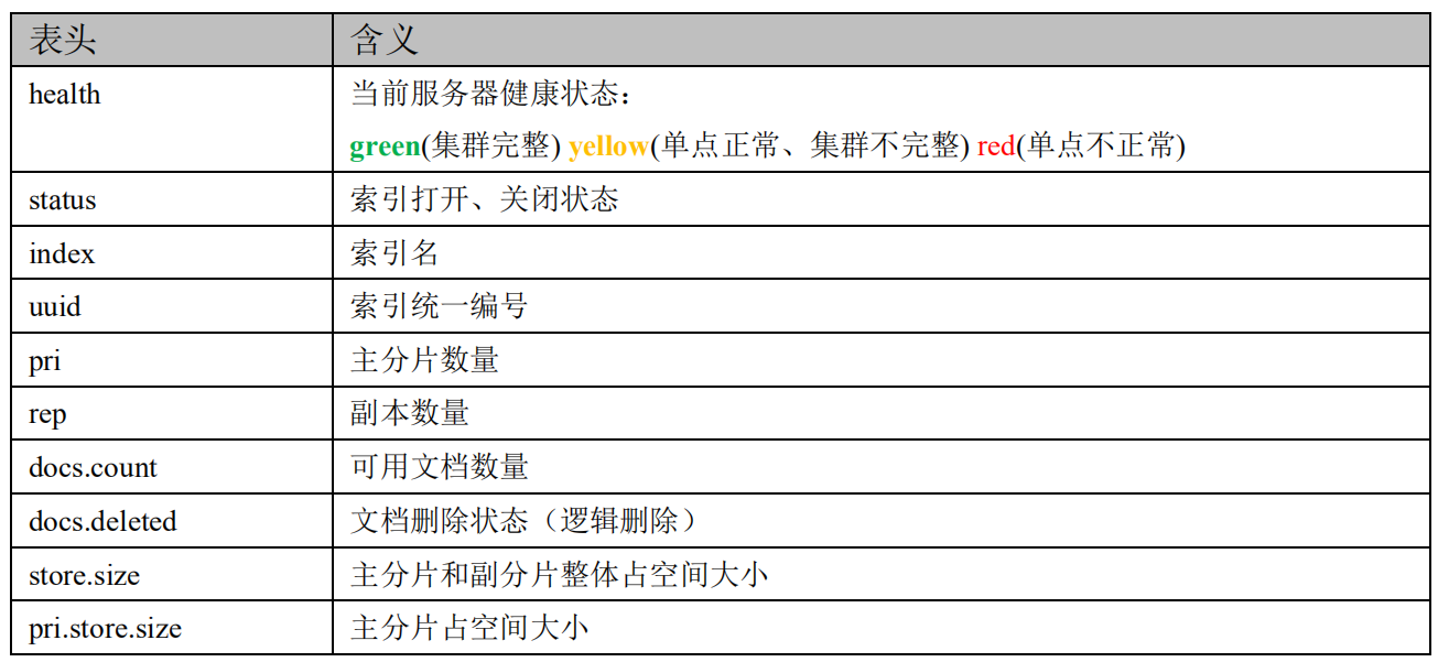 这里请求路径中的_cat 表示查看的意思,indices 表示索引,所以整体含义就是查看当前 ES