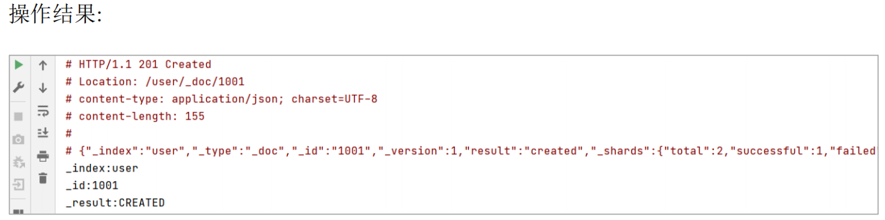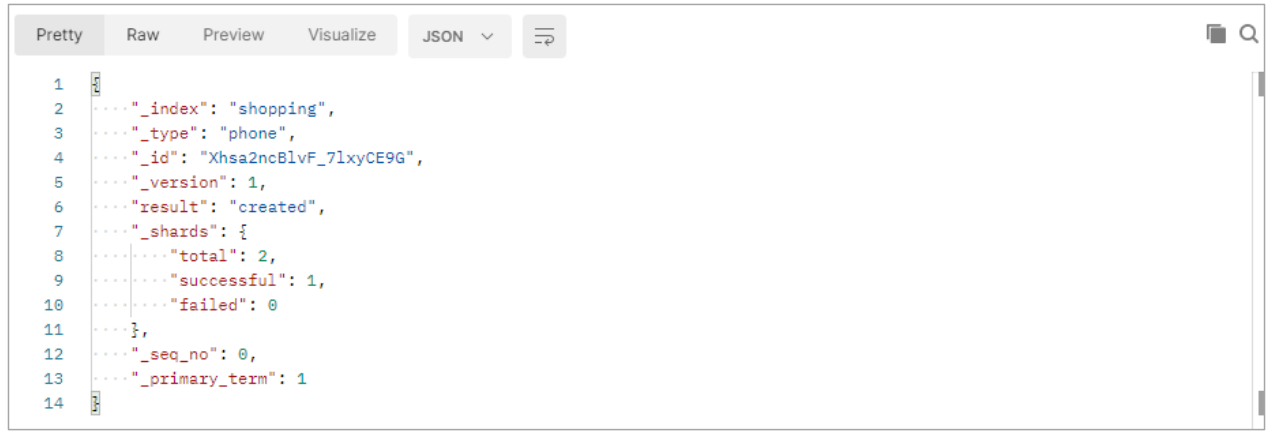 // 新增文档 - 请求对象 IndexRequest request = new IndexRequest(); // 设置索引及唯一性标识 request.index("user").id("1001"); // 创建数据对象 User user = new User(); user.setName("zhangsan"); user.setAge(30); user.setSex("男"); ObjectMapper objectMapper = new ObjectMapper(); String productJson = objectMapper.writeValueAsString(user); // 添加文档数据,数据格式为 JSON 格式 request.source(productJson,XContentType.JSON); // 客户端发送请求,获取响应对象 IndexResponse response = client.index(request, RequestOptions.DEFAULT); ////3.打印结果信息 System.out.println("_index:" + response.getIndex()); System.out.println("_id:" + response.getId()); System.out.println("_result:" + response.getResult());