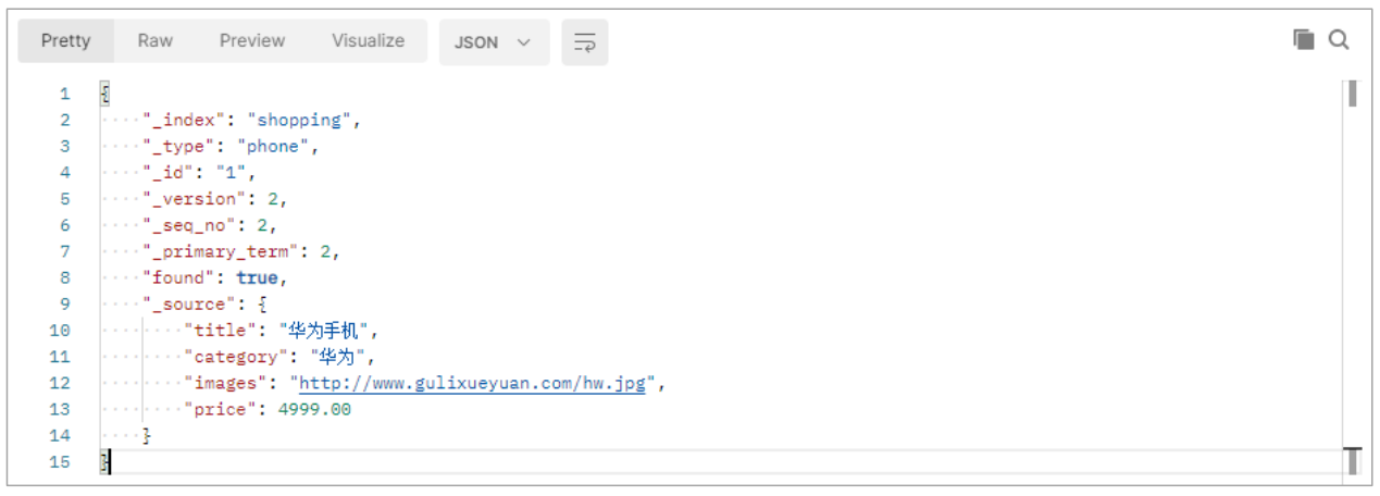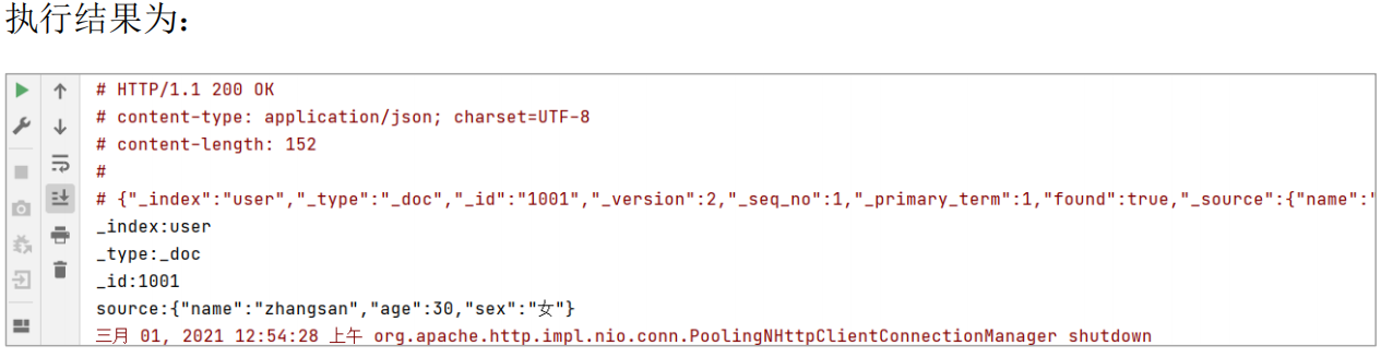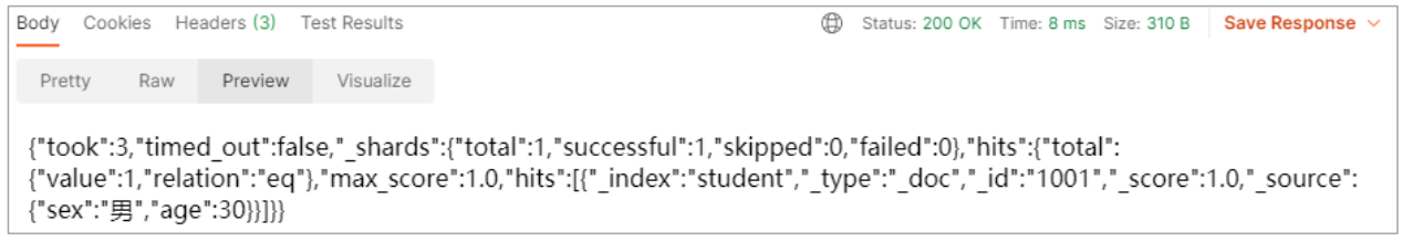 //1.创建请求对象 GetRequest request = new GetRequest().index("user").id("1001"); //2.客户端发送请求,获取响应对象 GetResponse response = client.get(request, RequestOptions.DEFAULT); ////3.打印结果信息 System.out.println("_index:" + response.getIndex()); System.out.println("_type:" + response.getType()); System.out.println("_id:" + response.getId()); System.out.println("source:" + response.getSourceAsString());