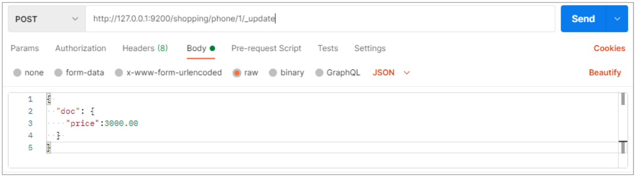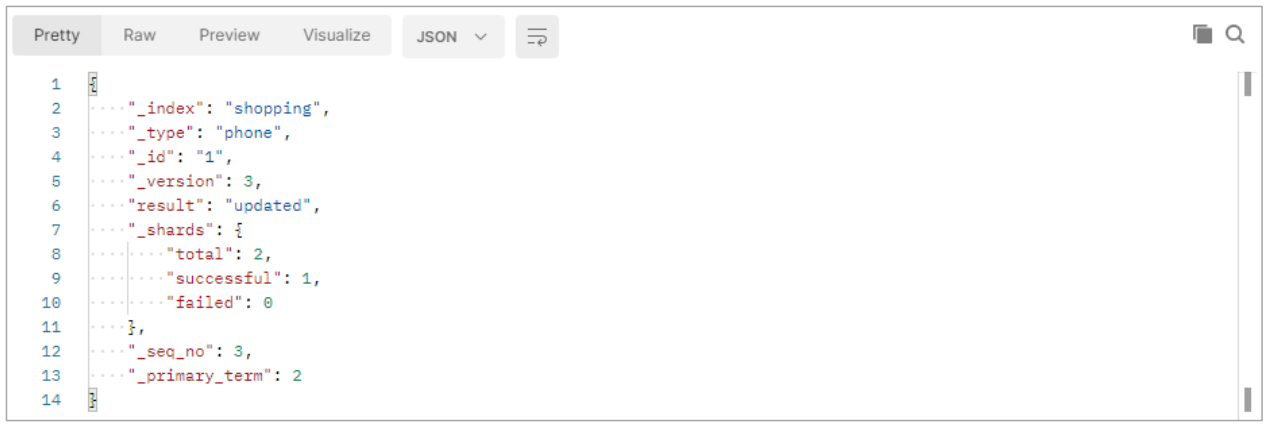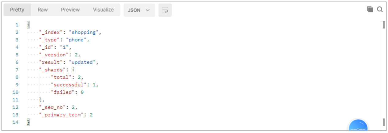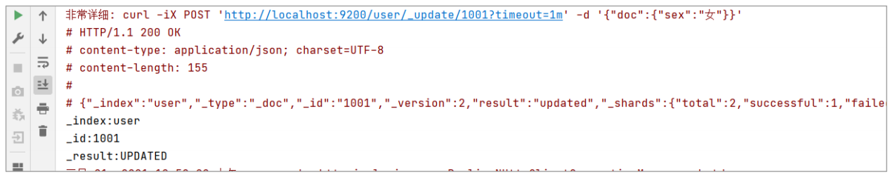 // 修改文档 - 请求对象 UpdateRequest request = new UpdateRequest(); // 配置修改参数 request.index("user").id("1001"); // 设置请求体,对数据进行修改 request.doc(XContentType.JSON, "sex", "女"); // 客户端发送请求,获取响应对象 UpdateResponse response = client.update(request, RequestOptions.DEFAULT); System.out.println("_index:" + response.getIndex()); System.out.println("_id:" + response.getId()); System.out.println("_result:" + response.getResult());