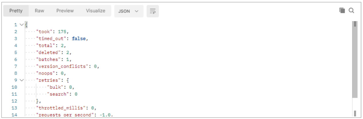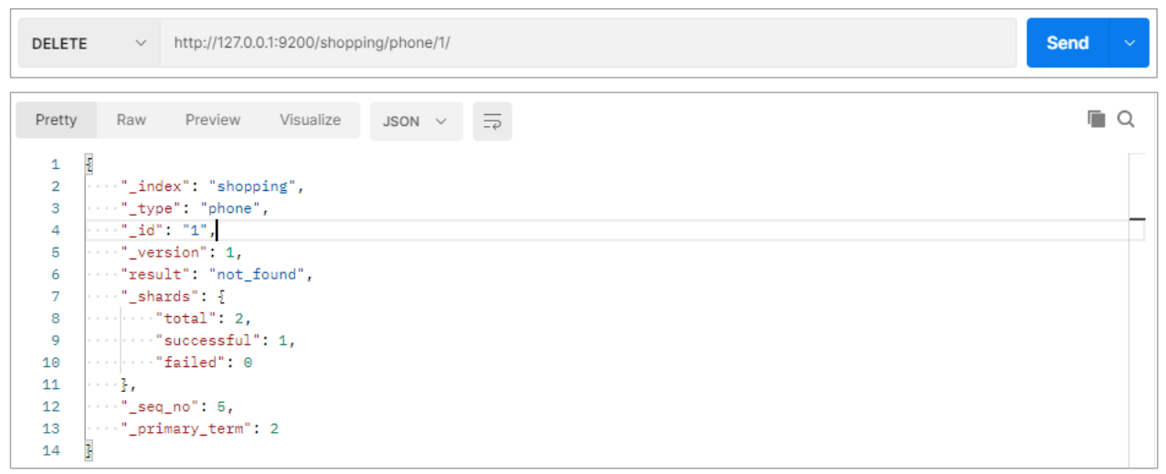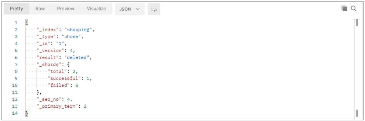 //创建请求对象 DeleteRequest request = new DeleteRequest().index("user").id("1"); //客户端发送请求,获取响应对象 DeleteResponse response = client.delete(request, RequestOptions.DEFAULT); //打印信息 System.out.println(response.toString());