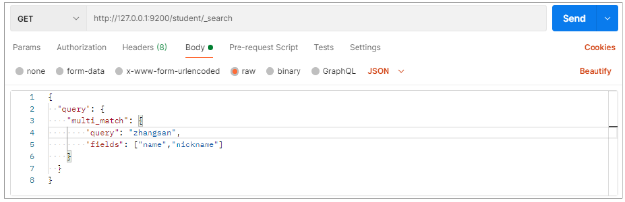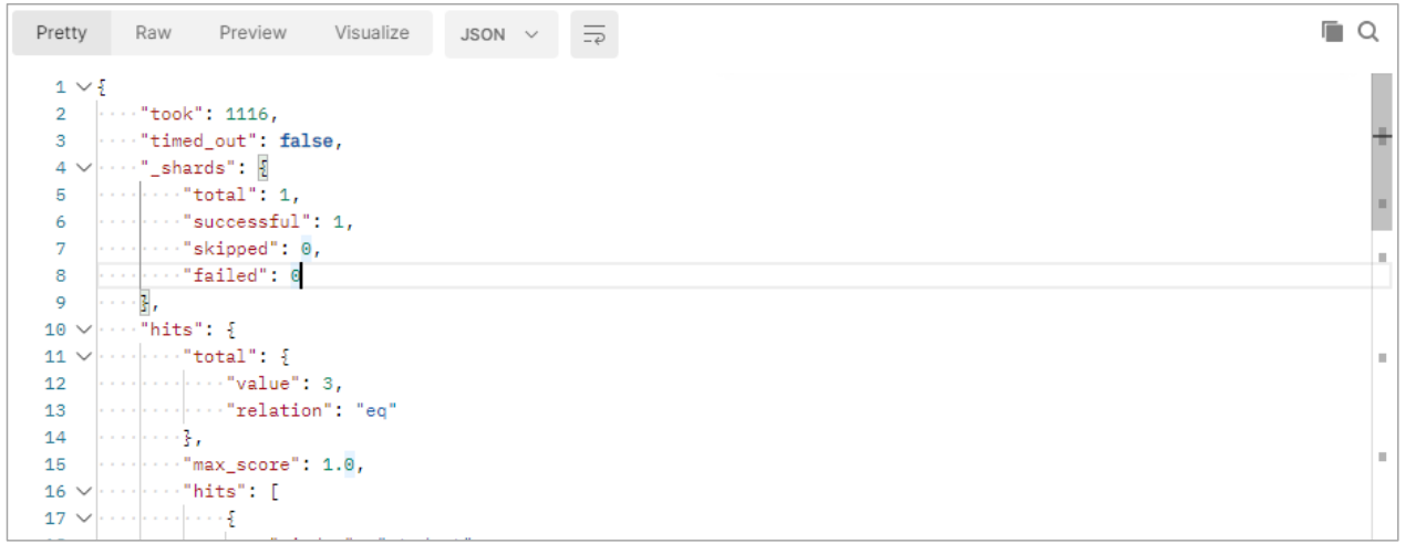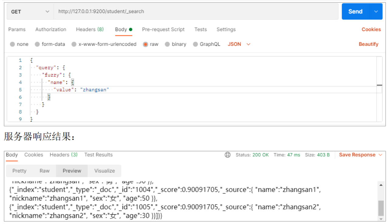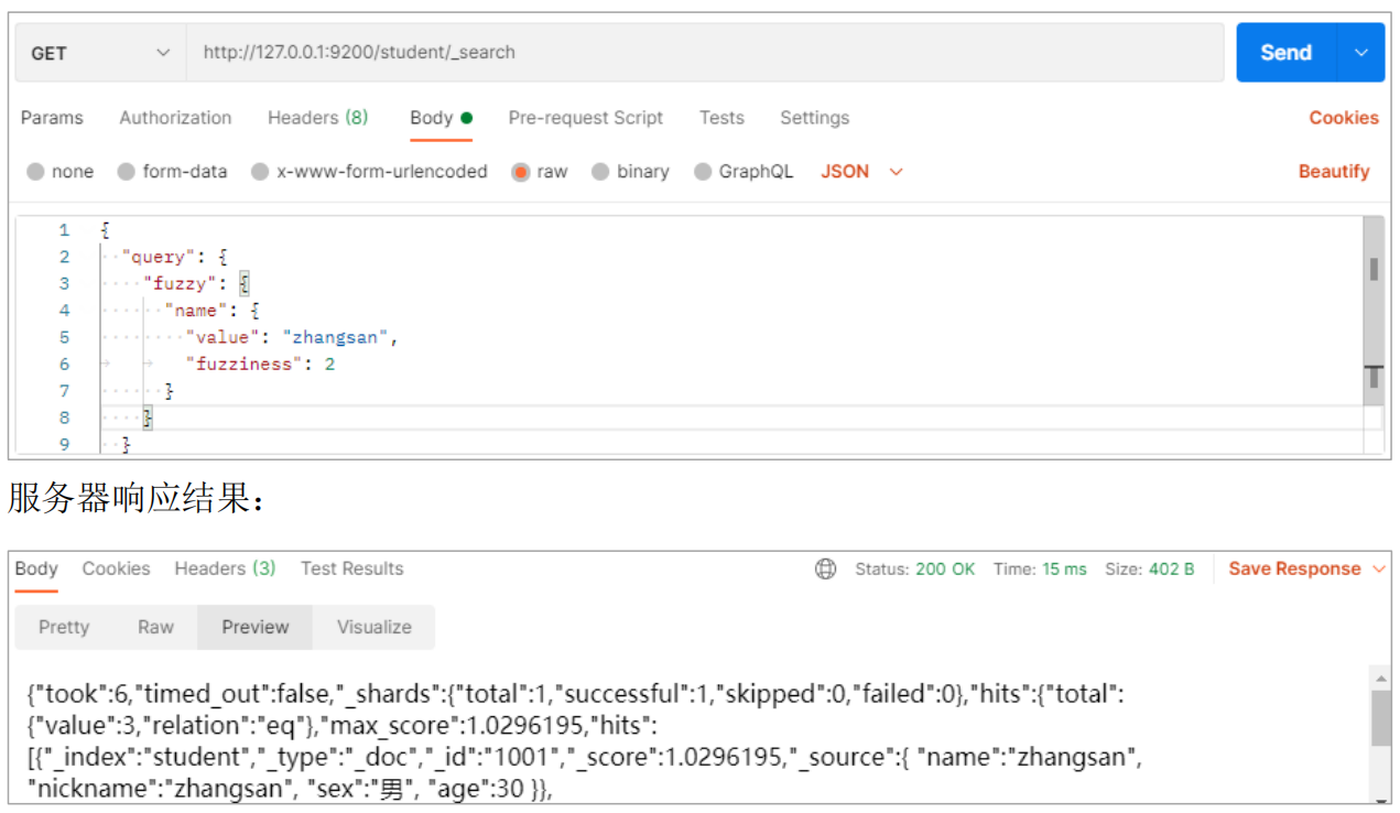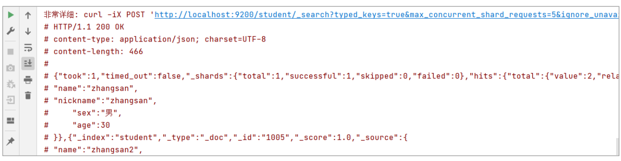 // 创建搜索请求对象 SearchRequest request = new SearchRequest(); request.indices("student"); // 构建查询的请求体 SearchSourceBuilder sourceBuilder = new SearchSourceBuilder(); sourceBuilder.query(QueryBuilders.fuzzyQuery("name","zhangsan").fuzziness(Fu zziness.ONE)); request.source(sourceBuilder); SearchResponse response = client.search(request, RequestOptions.DEFAULT); // 查询匹配 SearchHits hits = response.getHits(); System.out.println("took:" + response.getTook()); System.out.println("timeout:" + response.isTimedOut()); System.out.println("total:" + hits.getTotalHits()); System.out.println("MaxScore:" + hits.getMaxScore()); System.out.println("hits========>>"); for (SearchHit hit : hits) { //输出每条查询的结果信息 System.out.println(hit.getSourceAsString()); } System.out.println("<<========");