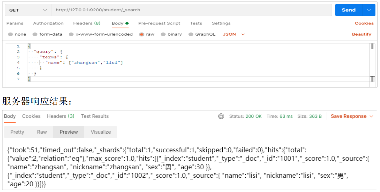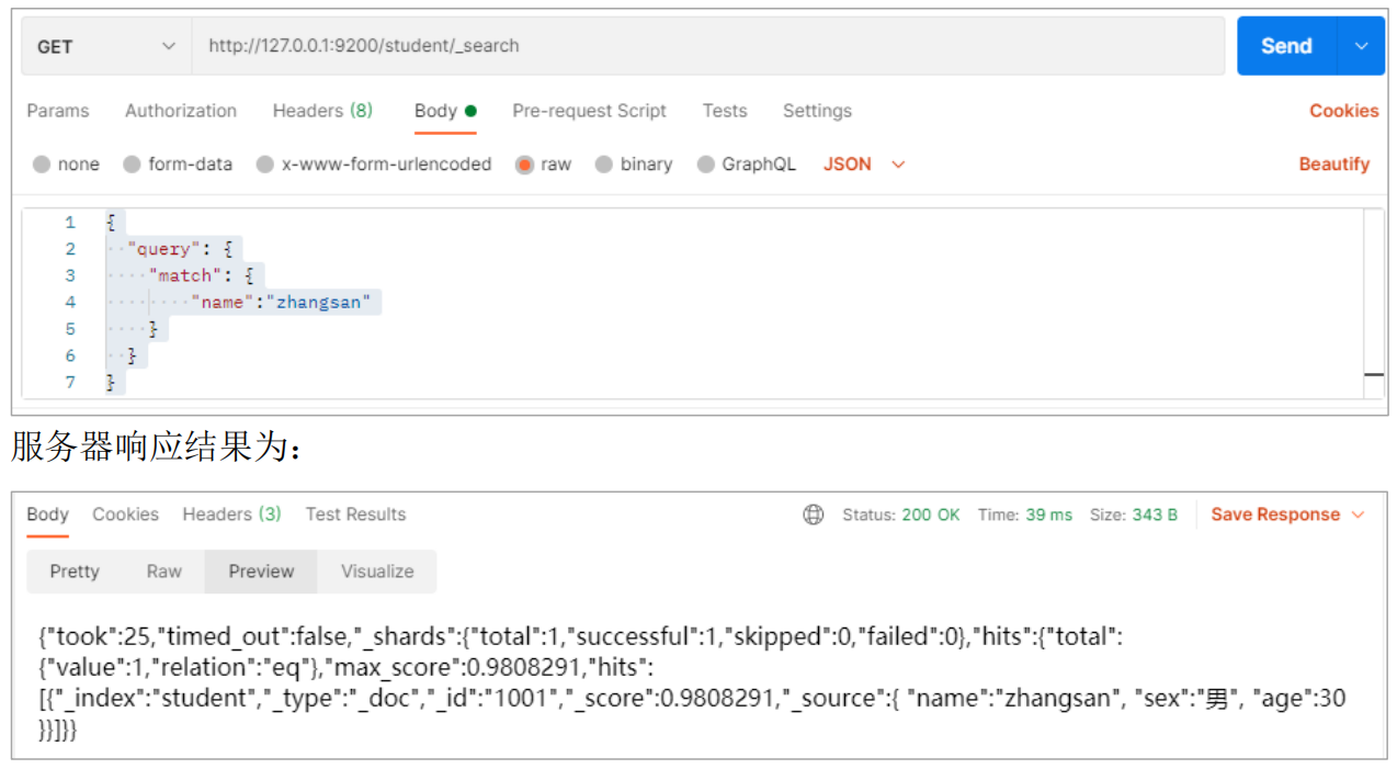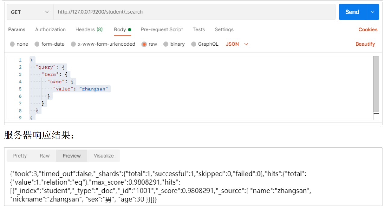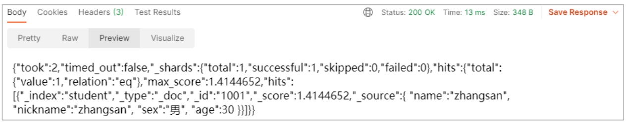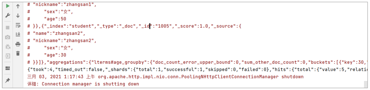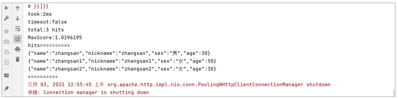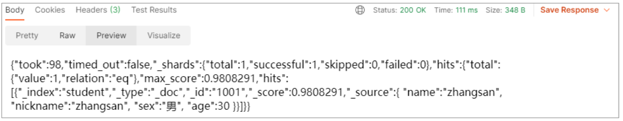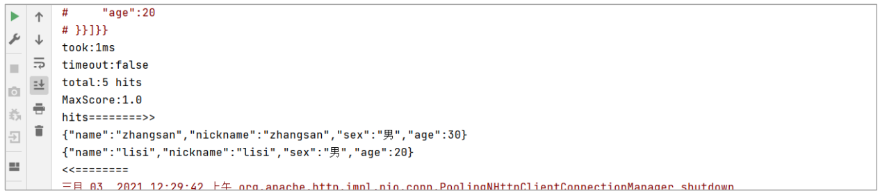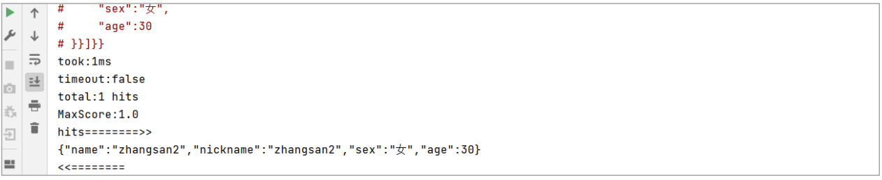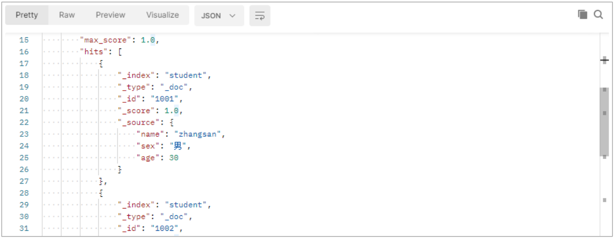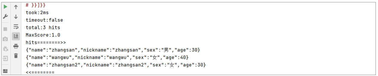 // 创建搜索请求对象 SearchRequest request = new SearchRequest(); request.indices("student"); // 构建查询的请求体 SearchSourceBuilder sourceBuilder = new SearchSourceBuilder(); sourceBuilder.query(QueryBuilders.termQuery("age", "30")); request.source(sourceBuilder); SearchResponse response = client.search(request, RequestOptions.DEFAULT); // 查询匹配 SearchHits hits = response.getHits(); System.out.println("took:" + response.getTook()); System.out.println("timeout:" + response.isTimedOut()); System.out.println("total:" + hits.getTotalHits()); System.out.println("MaxScore:" + hits.getMaxScore()); System.out.println("hits========>>"); for (SearchHit hit : hits) { //输出每条查询的结果信息 System.out.println(hit.getSourceAsString()); } System.out.println("<<========");