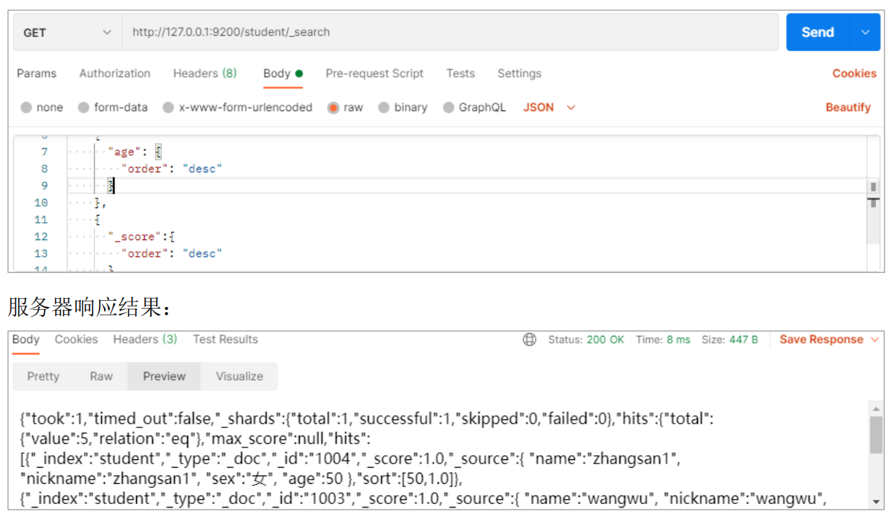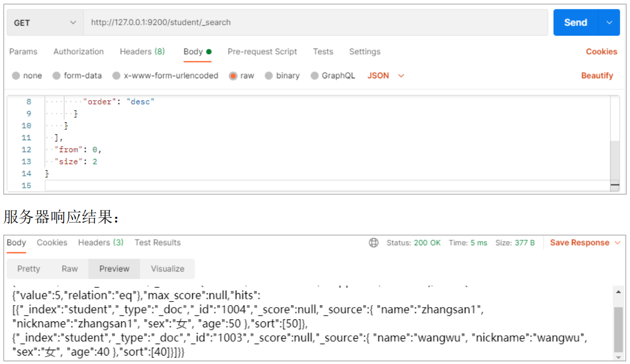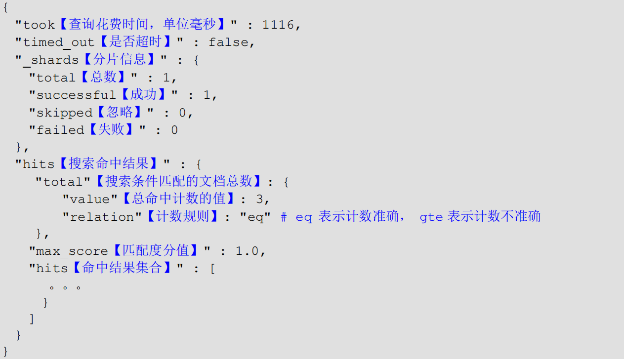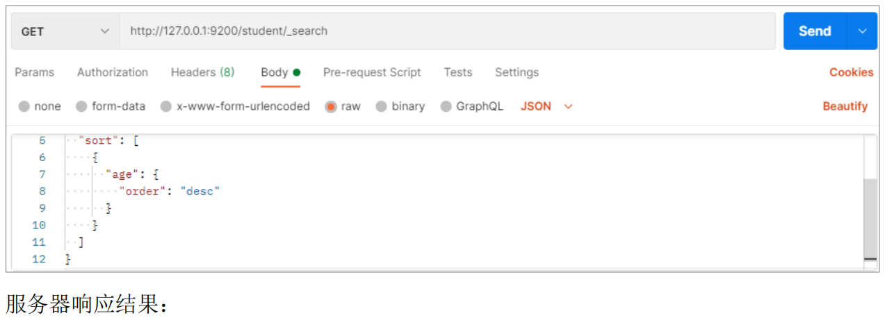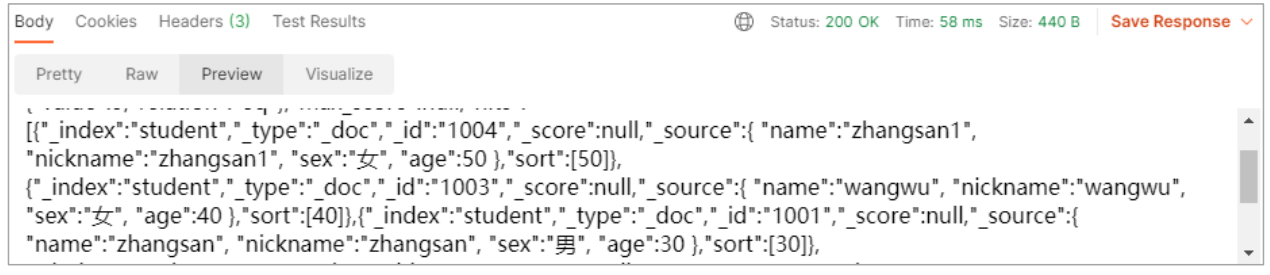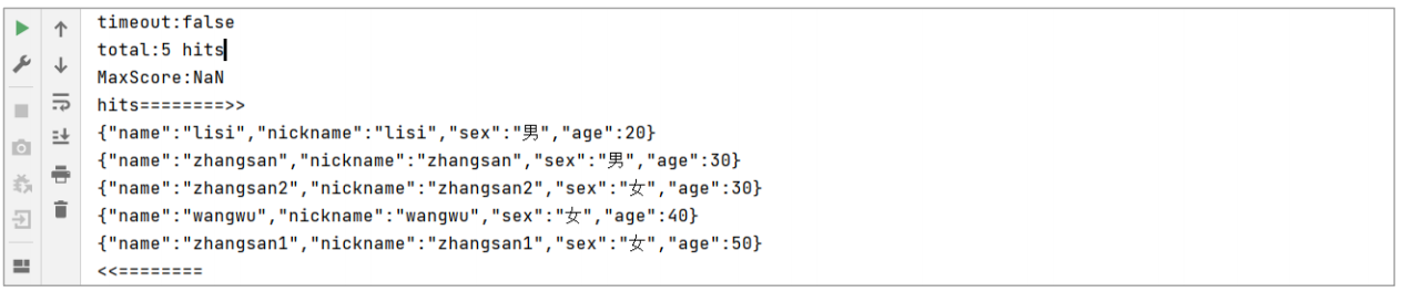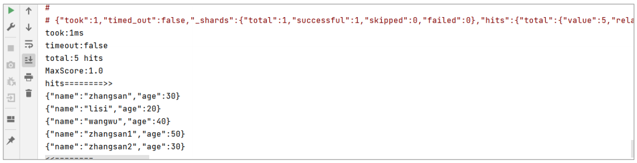 // 构建查询的请求体 SearchSourceBuilder sourceBuilder = new SearchSourceBuilder(); sourceBuilder.query(QueryBuilders.matchAllQuery()); // 排序 sourceBuilder.sort("age", SortOrder.ASC); request.source(sourceBuilder); SearchResponse response = client.search(request, RequestOptions.DEFAULT); // 查询匹配 SearchHits hits = response.getHits(); System.out.println("took:" + response.getTook()); System.out.println("timeout:" + response.isTimedOut()); System.out.println("total:" + hits.getTotalHits()); System.out.println("MaxScore:" + hits.getMaxScore()); System.out.println("hits========>>"); for (SearchHit hit : hits) { //输出每条查询的结果信息 System.out.println(hit.getSourceAsString()); } System.out.println("<<========");
