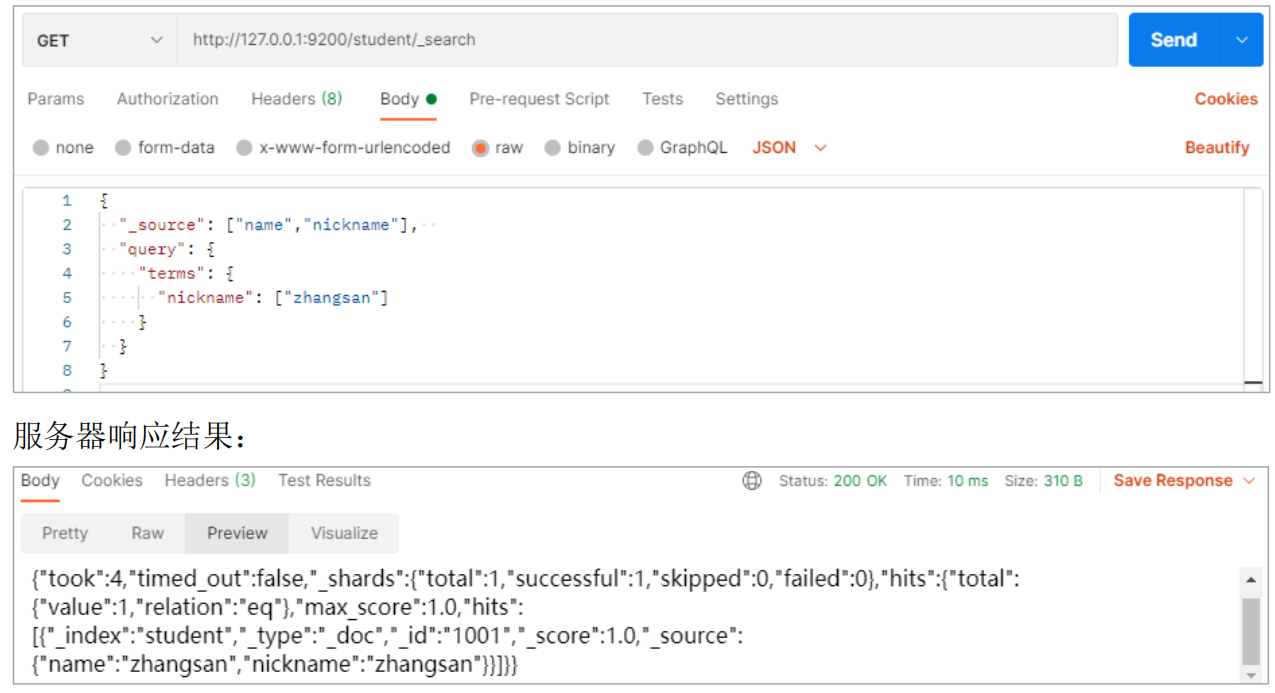 // 创建搜索请求对象 SearchRequest request = new SearchRequest(); request.indices("student"); // 构建查询的请求体 SearchSourceBuilder sourceBuilder = new SearchSourceBuilder(); sourceBuilder.query(QueryBuilders.matchAllQuery()); //查询字段过滤 String[] excludes = {}; String[] includes = {"name", "age"}; sourceBuilder.fetchSource(includes, excludes); request.source(sourceBuilder); SearchResponse response = client.search(request, RequestOptions.DEFAULT); // 查询匹配 SearchHits hits = response.getHits(); System.out.println("took:" + response.getTook()); System.out.println("timeout:" + response.isTimedOut()); System.out.println("total:" + hits.getTotalHits()); System.out.println("MaxScore:" + hits.getMaxScore()); System.out.println("hits========>>"); for (SearchHit hit : hits) { //输出每条查询的结果信息 System.out.println(hit.getSourceAsString()); } System.out.println("<<========");