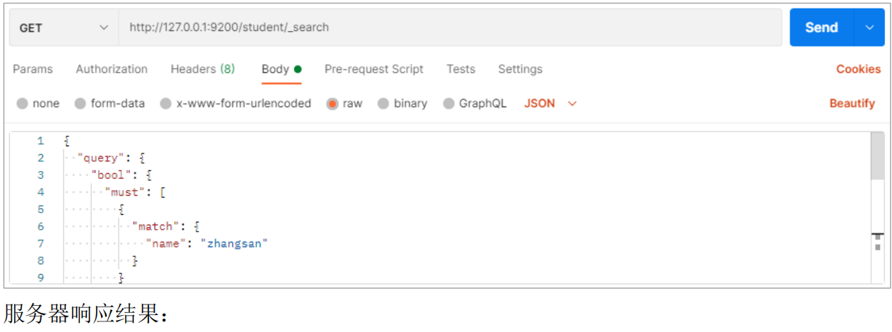 // 创建搜索请求对象 SearchRequest request = new SearchRequest(); request.indices("student"); // 构建查询的请求体 SearchSourceBuilder sourceBuilder = new SearchSourceBuilder(); BoolQueryBuilder boolQueryBuilder = QueryBuilders.boolQuery(); // 必须包含 boolQueryBuilder.must(QueryBuilders.matchQuery("age", "30")); // 一定不含 boolQueryBuilder.mustNot(QueryBuilders.matchQuery("name", "zhangsan")); // 可能包含 boolQueryBuilder.should(QueryBuilders.matchQuery("sex", "男")); sourceBuilder.query(boolQueryBuilder); request.source(sourceBuilder); SearchResponse response = client.search(request, RequestOptions.DEFAULT); // 查询匹配 SearchHits hits = response.getHits(); System.out.println("took:" + response.getTook()); System.out.println("timeout:" + response.isTimedOut()); System.out.println("total:" + hits.getTotalHits()); System.out.println("MaxScore:" + hits.getMaxScore()); System.out.println("hits========>>"); for (SearchHit hit : hits) { //输出每条查询的结果信息 System.out.println(hit.getSourceAsString()); } System.out.println("<<========");