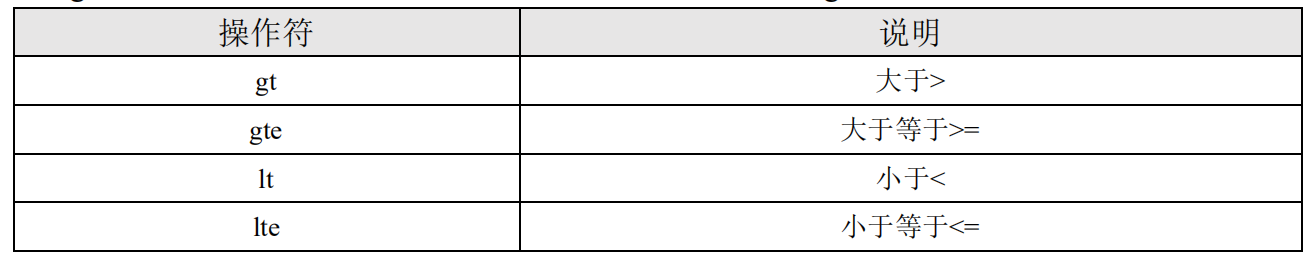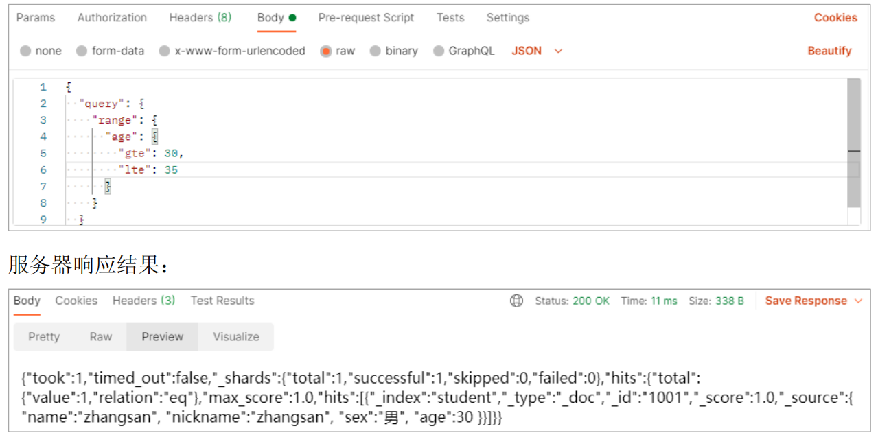 // 创建搜索请求对象 SearchRequest request = new SearchRequest(); request.indices("student"); // 构建查询的请求体 SearchSourceBuilder sourceBuilder = new SearchSourceBuilder(); RangeQueryBuilder rangeQuery = QueryBuilders.rangeQuery("age"); // 大于等于 rangeQuery.gte("30"); // 小于等于 rangeQuery.lte("40"); sourceBuilder.query(rangeQuery); request.source(sourceBuilder); SearchResponse response = client.search(request, RequestOptions.DEFAULT); // 查询匹配 SearchHits hits = response.getHits(); System.out.println("took:" + response.getTook()); System.out.println("timeout:" + response.isTimedOut()); System.out.println("total:" + hits.getTotalHits()); System.out.println("MaxScore:" + hits.getMaxScore()); System.out.println("hits========>>"); for (SearchHit hit : hits) { //输出每条查询的结果信息 System.out.println(hit.getSourceAsString()); } System.out.println("<<========");