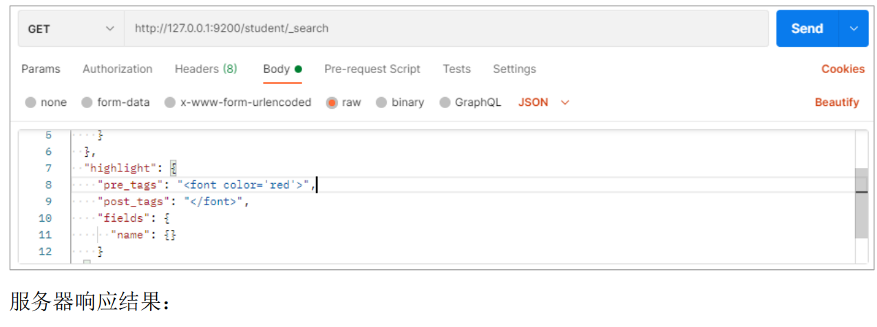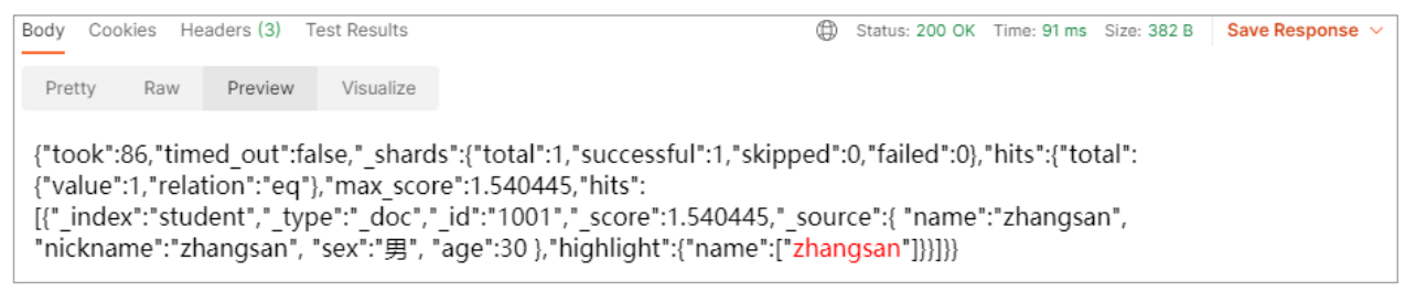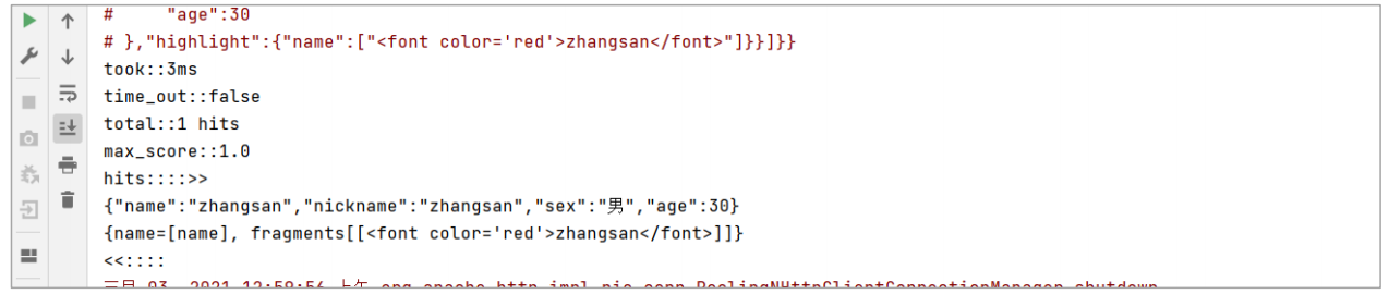 // 高亮查询 SearchRequest request = new SearchRequest().indices("student"); //2.创建查询请求体构建器 SearchSourceBuilder sourceBuilder = new SearchSourceBuilder(); //构建查询方式:高亮查询 TermsQueryBuilder termsQueryBuilder = QueryBuilders.termsQuery("name","zhangsan"); //设置查询方式 sourceBuilder.query(termsQueryBuilder); //构建高亮字段 HighlightBuilder highlightBuilder = new HighlightBuilder(); highlightBuilder.preTags("<font color='red'>");//设置标签前缀 highlightBuilder.postTags("</font>");//设置标签后缀 highlightBuilder.field("name");//设置高亮字段 //设置高亮构建对象 sourceBuilder.highlighter(highlightBuilder); //设置请求体 request.source(sourceBuilder); //3.客户端发送请求,获取响应对象 SearchResponse response = client.search(request, RequestOptions.DEFAULT); //4.打印响应结果 SearchHits hits = response.getHits(); System.out.println("took::"+response.getTook()); System.out.println("time_out::"+response.isTimedOut()); System.out.println("total::"+hits.getTotalHits()); System.out.println("max_score::"+hits.getMaxScore()); System.out.println("hits::::>>"); for (SearchHit hit : hits) { String sourceAsString = hit.getSourceAsString(); System.out.println(sourceAsString); //打印高亮结果 Map<String, HighlightField> highlightFields = hit.getHighlightFields(); System.out.println(highlightFields); } System.out.println("<<::::");