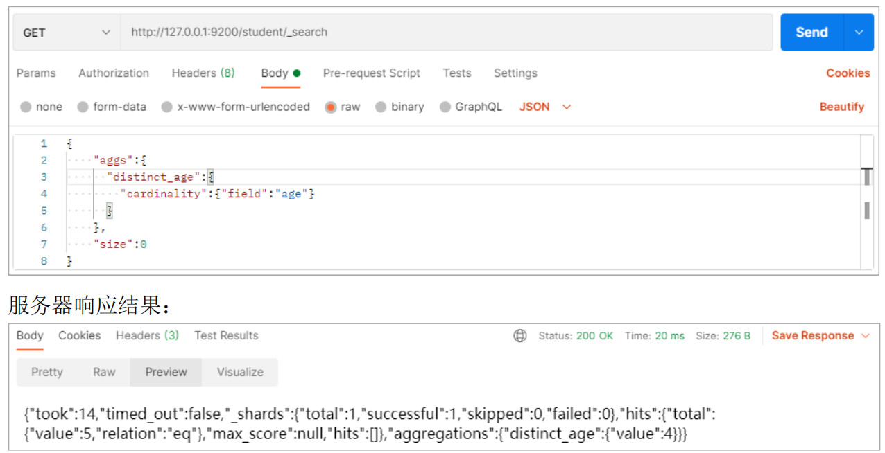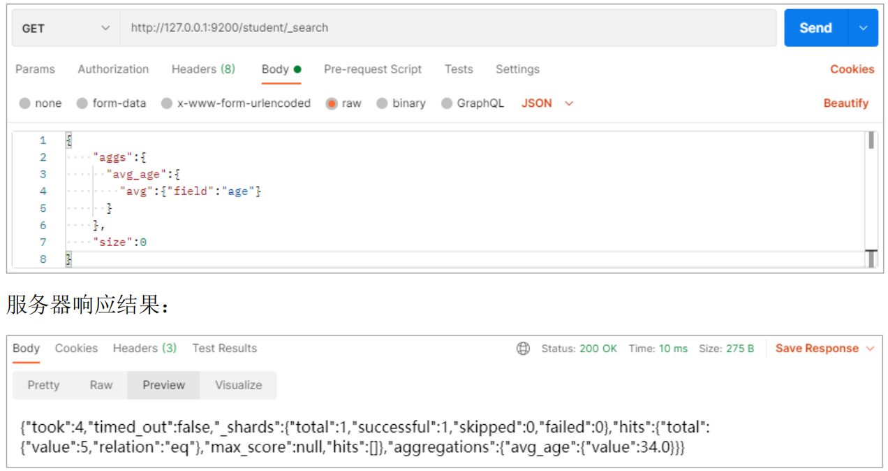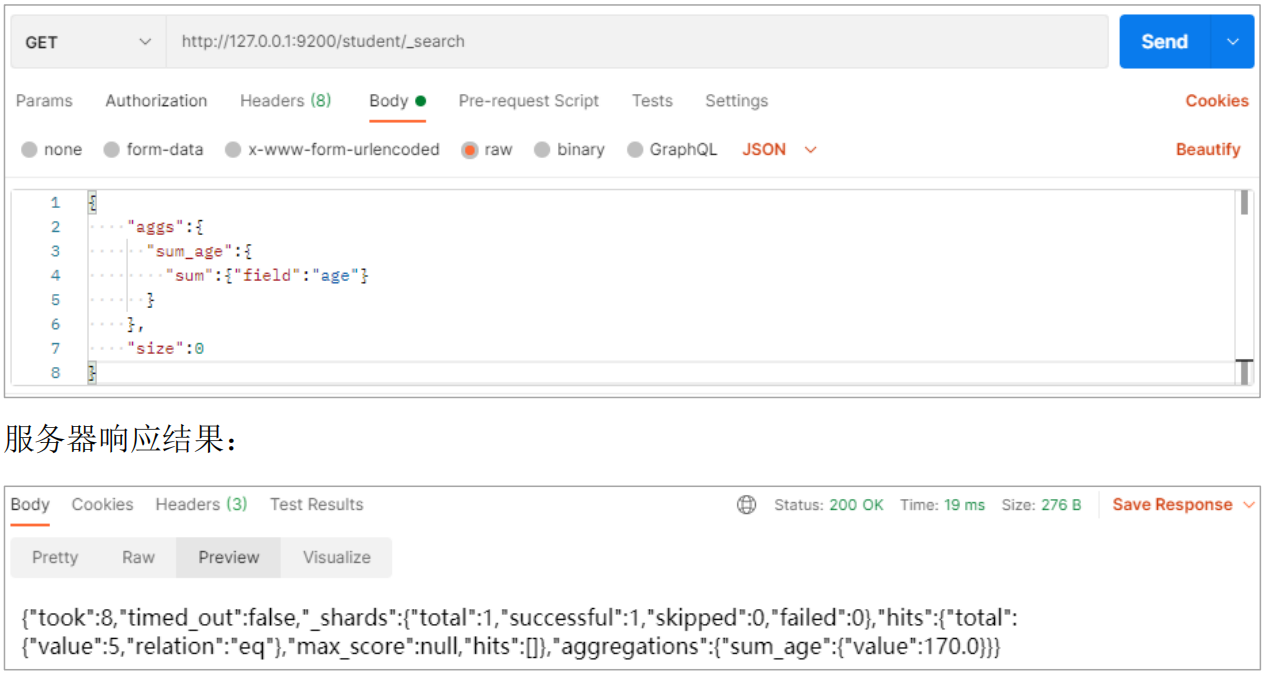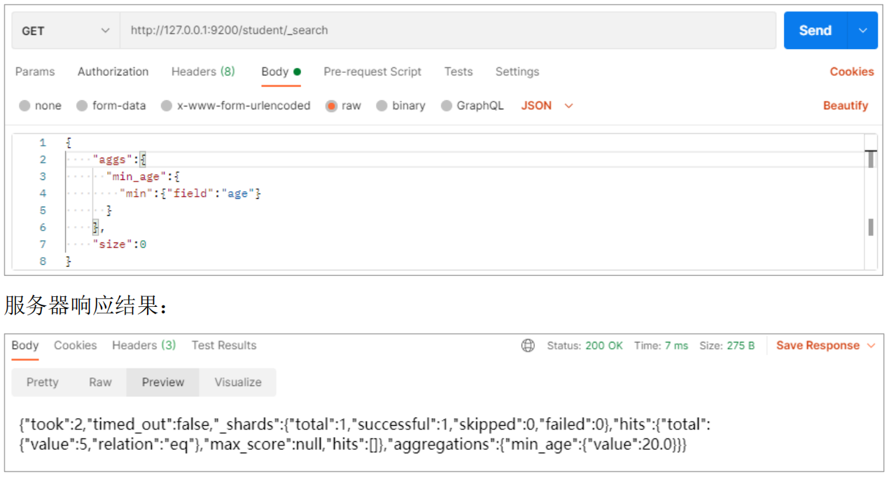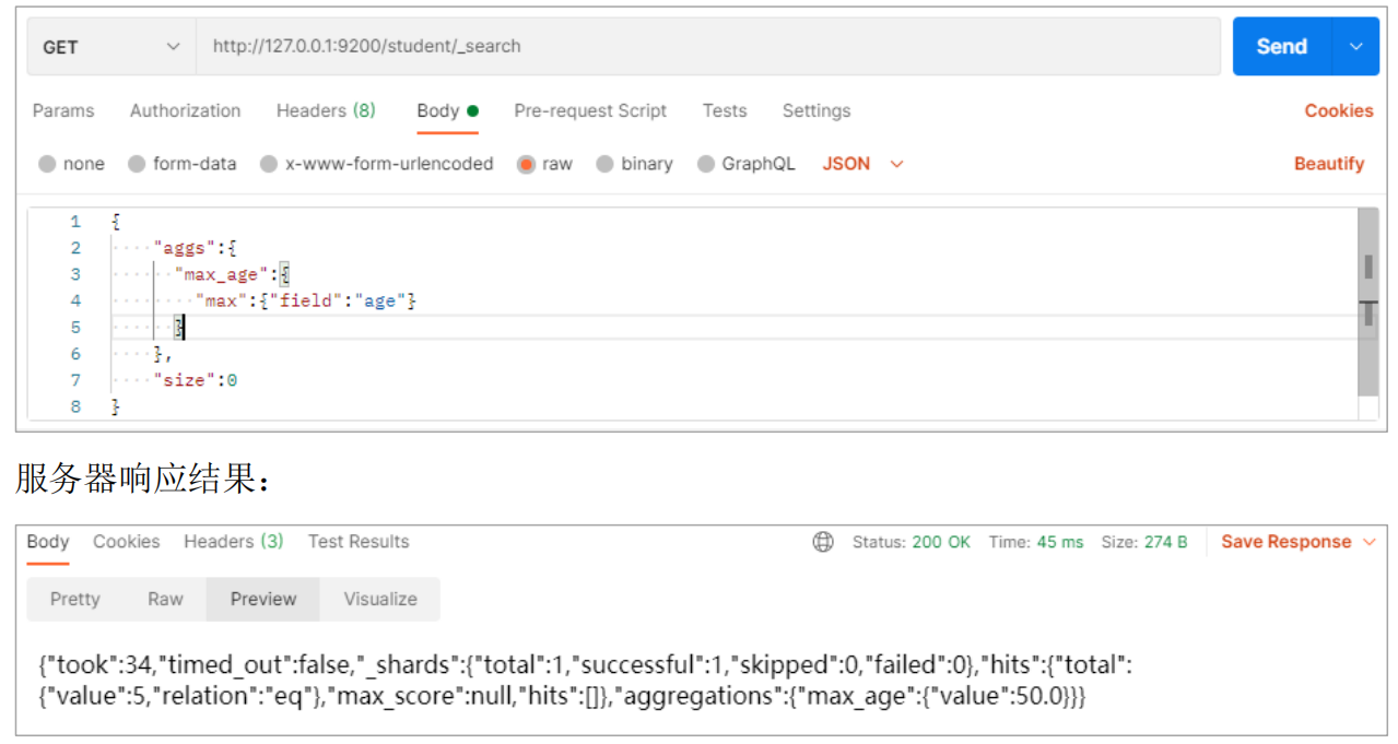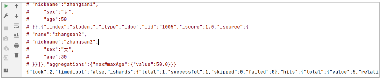 // 高亮查询 SearchRequest request = new SearchRequest().indices("student"); SearchSourceBuilder sourceBuilder = new SearchSourceBuilder(); sourceBuilder.aggregation(AggregationBuilders.max("maxAge").field("age")); //设置请求体 request.source(sourceBuilder); //3.客户端发送请求,获取响应对象 SearchResponse response = client.search(request, RequestOptions.DEFAULT); //4.打印响应结果 SearchHits hits = response.getHits(); System.out.println(response);