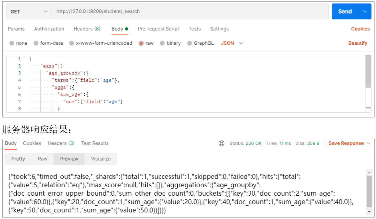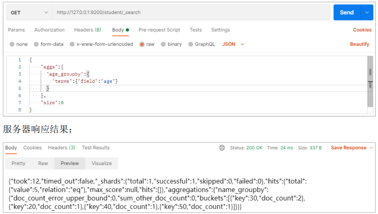 // 高亮查询 SearchRequest request = new SearchRequest().indices("student"); SearchSourceBuilder sourceBuilder = new SearchSourceBuilder(); sourceBuilder.aggregation(AggregationBuilders.terms("age_groupby").field("ag e")); //设置请求体 request.source(sourceBuilder); //3.客户端发送请求,获取响应对象 SearchResponse response = client.search(request, RequestOptions.DEFAULT); //4.打印响应结果 SearchHits hits = response.getHits(); System.out.println(response);