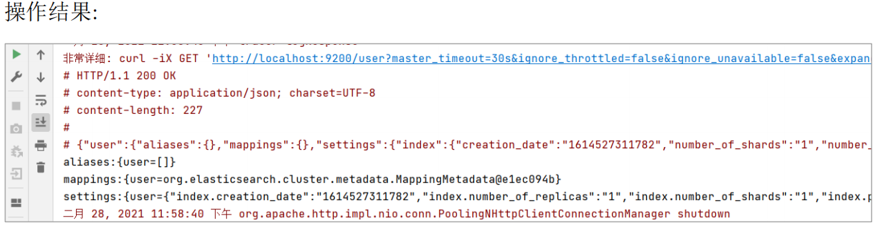 // 查询索引 - 请求对象 GetIndexRequest request = new GetIndexRequest("user"); // 发送请求,获取响应 GetIndexResponse response = client.indices().get(request, RequestOptions.DEFAULT); System.out.println("aliases:"+response.getAliases()); System.out.println("mappings:"+response.getMappings()); System.out.println("settings:"+response.getSettings());