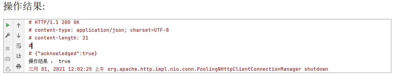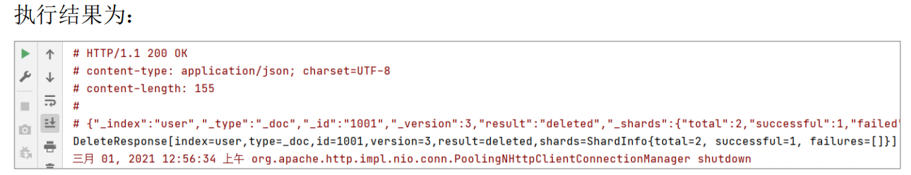 // 删除索引 - 请求对象 DeleteIndexRequest request = new DeleteIndexRequest("user"); // 发送请求,获取响应 AcknowledgedResponse response = client.indices().delete(request, RequestOptions.DEFAULT); // 操作结果 System.out.println("操作结果 : " + response.isAcknowledged());