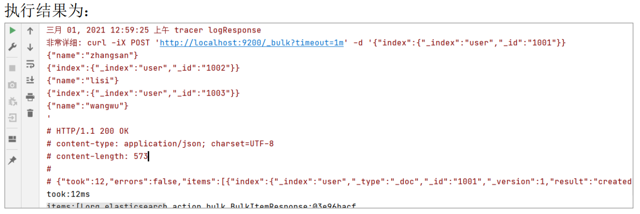 //创建批量新增请求对象 BulkRequest request = new BulkRequest(); request.add(new IndexRequest().index("user").id("1001").source(XContentType.JSON, "name", "zhangsan")); request.add(new IndexRequest().index("user").id("1002").source(XContentType.JSON, "name", "lisi")); request.add(new IndexRequest().index("user").id("1003").source(XContentType.JSON, "name", "wangwu")); //客户端发送请求,获取响应对象 BulkResponse responses = client.bulk(request, RequestOptions.DEFAULT); //打印结果信息 System.out.println("took:" + responses.getTook()); System.out.println("items:" + responses.getItems());