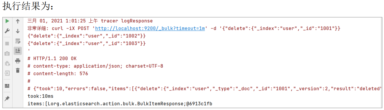//创建批量删除请求对象 BulkRequest request = new BulkRequest(); request.add(new DeleteRequest().index("user").id("1001")); request.add(new DeleteRequest().index("user").id("1002")); request.add(new DeleteRequest().index("user").id("1003")); //客户端发送请求,获取响应对象 BulkResponse responses = client.bulk(request, RequestOptions.DEFAULT); //打印结果信息 System.out.println("took:" + responses.getTook()); System.out.println("items:" + responses.getItems());