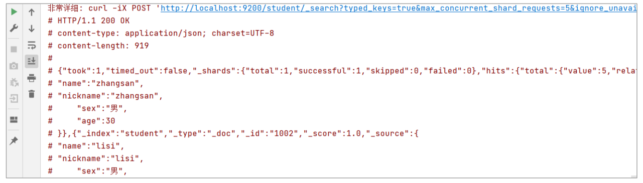 // 创建搜索请求对象 SearchRequest request = new SearchRequest(); request.indices("student"); // 构建查询的请求体 SearchSourceBuilder sourceBuilder = new SearchSourceBuilder(); // 查询所有数据 sourceBuilder.query(QueryBuilders.matchAllQuery()); request.source(sourceBuilder); SearchResponse response = client.search(request, RequestOptions.DEFAULT); // 查询匹配 SearchHits hits = response.getHits(); System.out.println("took:" + response.getTook()); System.out.println("timeout:" + response.isTimedOut()); System.out.println("total:" + hits.getTotalHits()); System.out.println("MaxScore:" + hits.getMaxScore()); System.out.println("hits========>>"); for (SearchHit hit : hits) { //输出每条查询的结果信息 System.out.println(hit.getSourceAsString()); } System.out.println("<<========");
