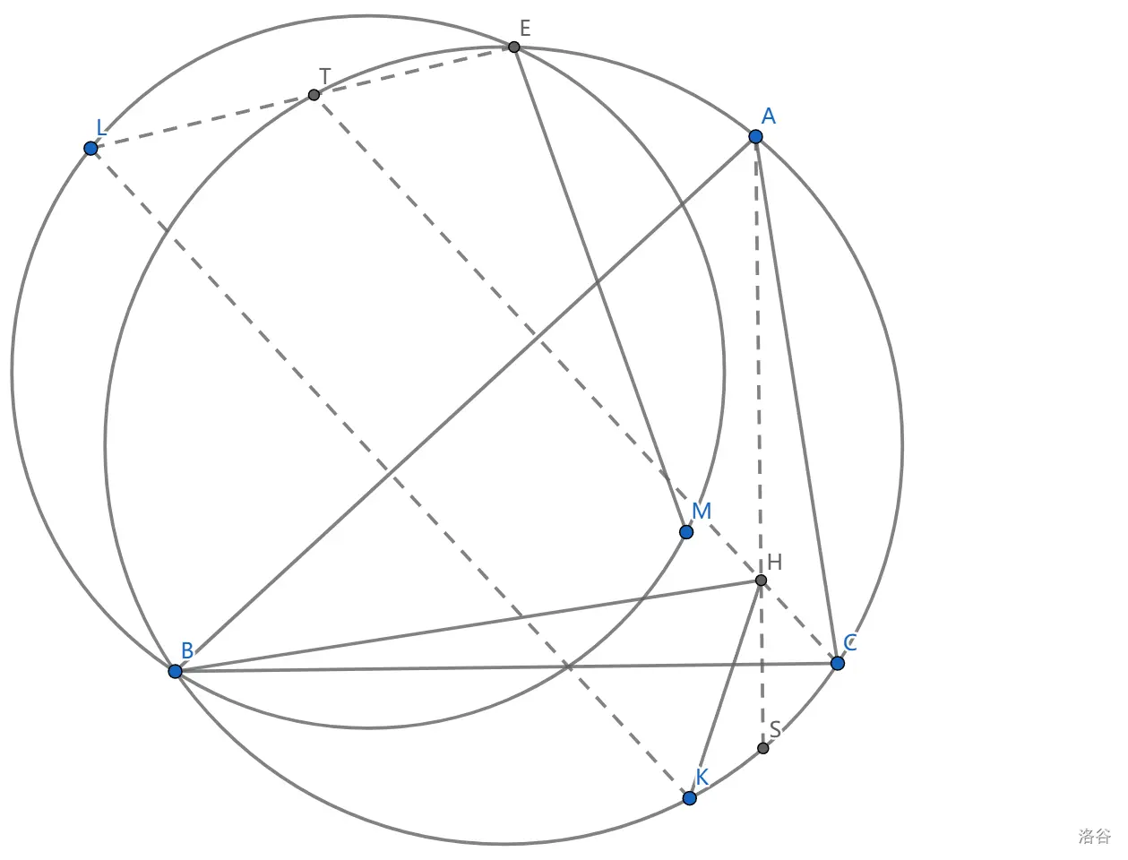 我们首先要转换问题,我们会说:既然 \(K,M\) 关于 \(BC\) 对称,我们就取 \(H\) 关于 \(BC\) 对称点 \(S\) ,然后题目等价于证明 \(EMS\) 共线。