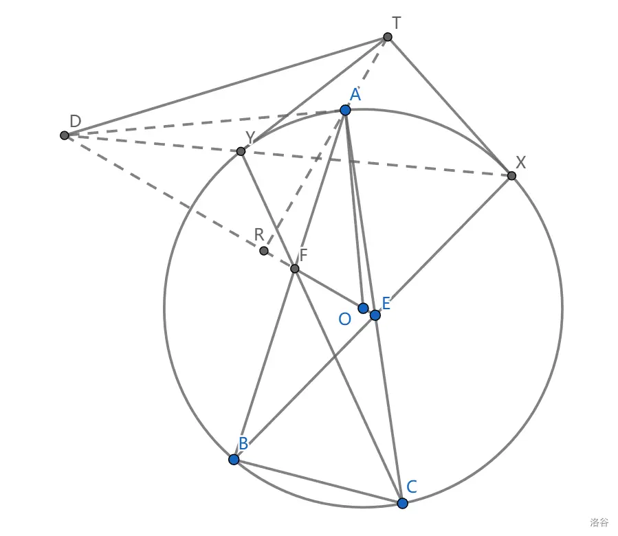 我们看到 \(DR\cdot DO=DA^2=DY\cdot DX\) ,所以 \(ORYX\) 共圆,而且 \(T\) 在这个圆上,很不错, \(OT\) 是直径,从而 \(\angle ORT=Rt\angle =\angle ORA\) ,这就完成了证明。