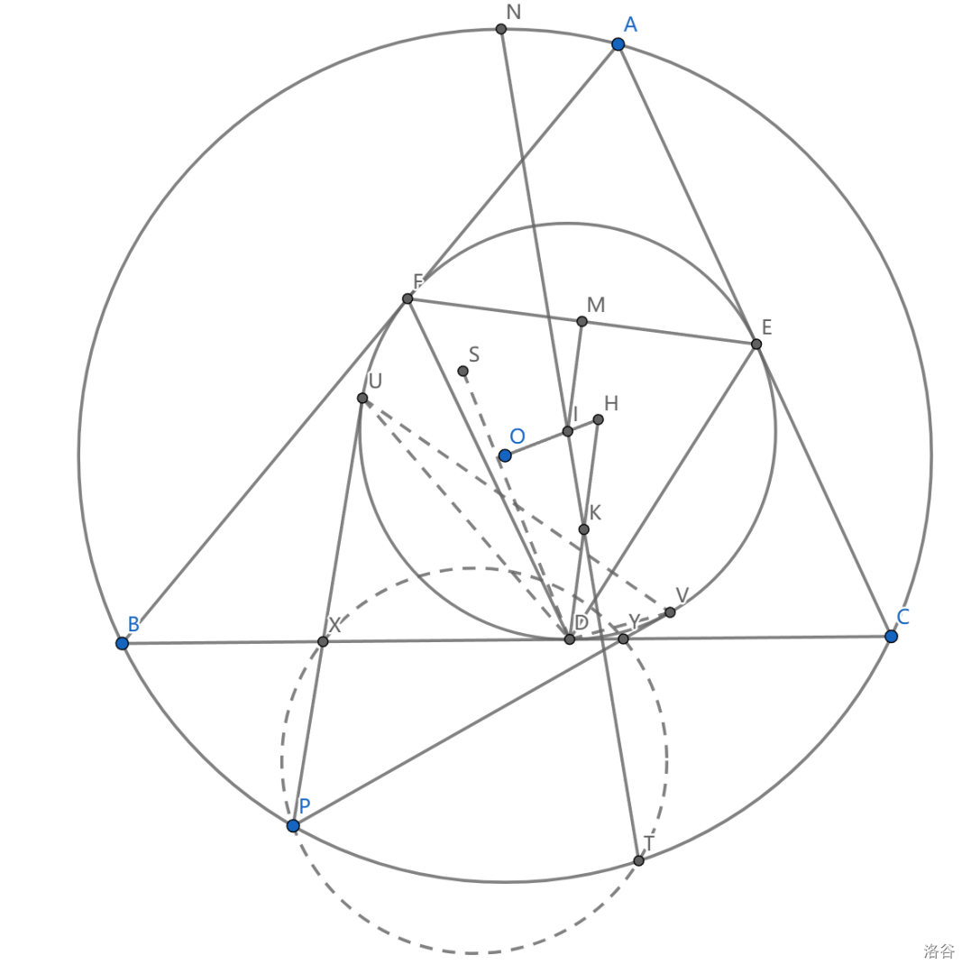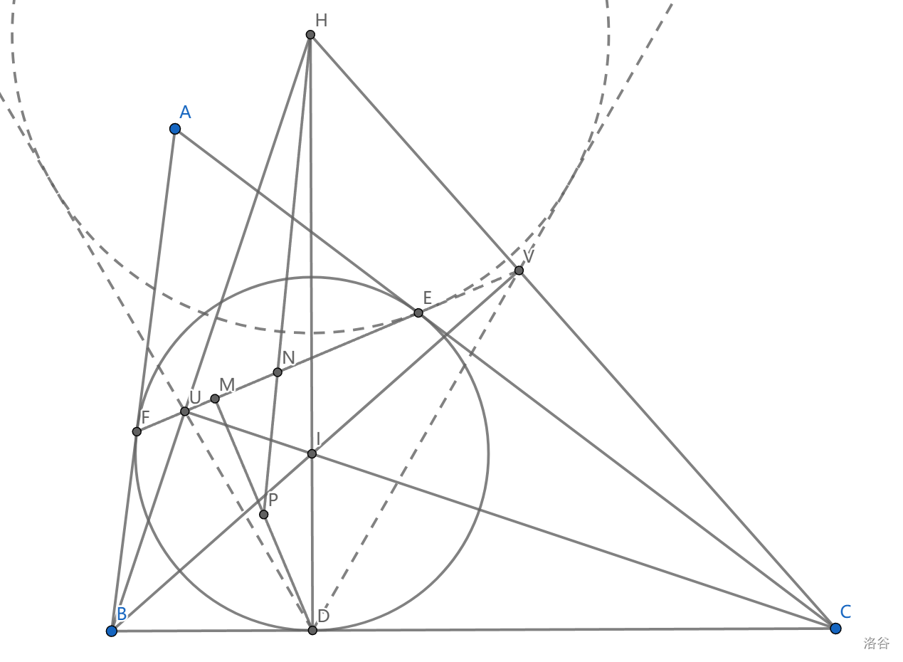 因为 \(I\) 是 \(\triangle BHC\) 的垂心,所以它是 \(\triangle DUV\) 的内心,因此 \(EF\) 的中点 \(N\) 是它的内切圆切点。于是我们看到了性质 \(6\) 的构型,我们只要证明 \(H\) 是 \(\triangle DUV\) 的旁心