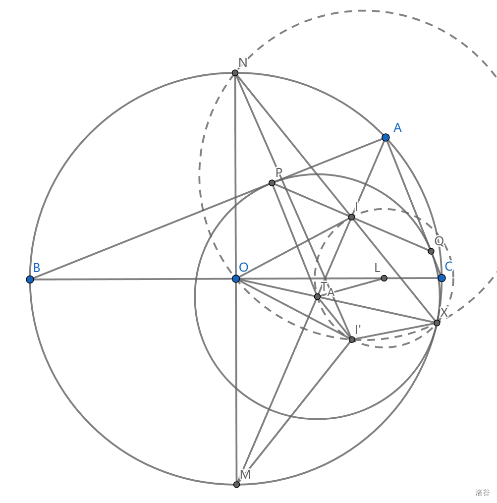 我们还没有利用伪内切圆的一些性质,比如说 \(XIN,XT_AO,AIT_AM\) 分别共线。一个非常不容易的观察是, \(I'\) 在 \(\triangle XIT_A,\triangle MNI\) 的外接圆上,它是四边形 \(INOT_A\) 的密克点!
