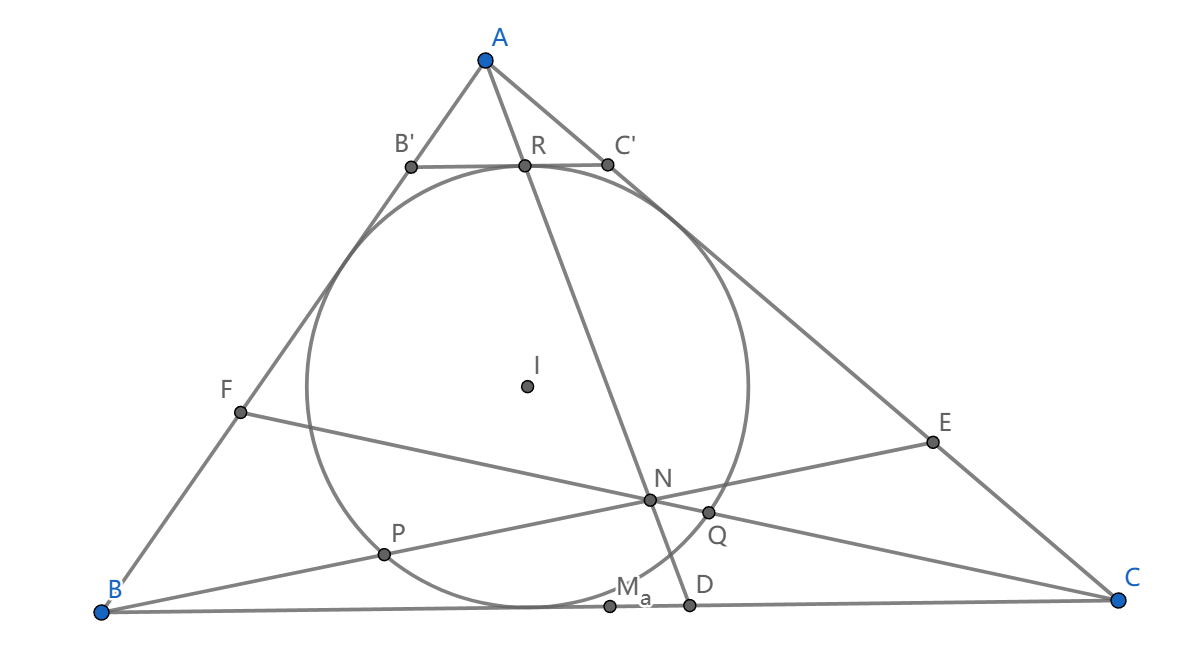 注意到 \(\triangle AB'C'(R')\sim\triangle ABC(D)\) ,并且 \(AR//M_aI\) (中位线),所以 \(AD,BE,CF\) 共点 \(N\) 相当于中点三角形 \(M_aM_bM_c\) 中的 \(I\)