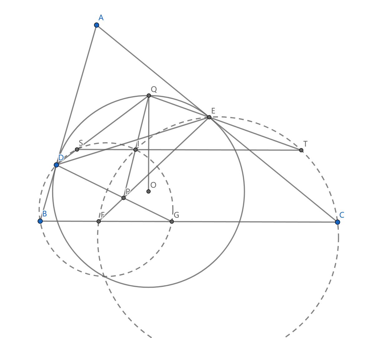 我们再用共圆导角,看到 \(\angle QSI=\angle DBI=\frac 12B,\angle QTI=\frac 12C\) ,所以 \(\angle QSI+\angle QTI+\angle SQT=\pi\) 给出 \(SIT\) 共线, \(\triangle QDE\sim\triangle QTS\) ,看到 \(QD\cdot QS=QE\cdot QT\) ,这就证毕。