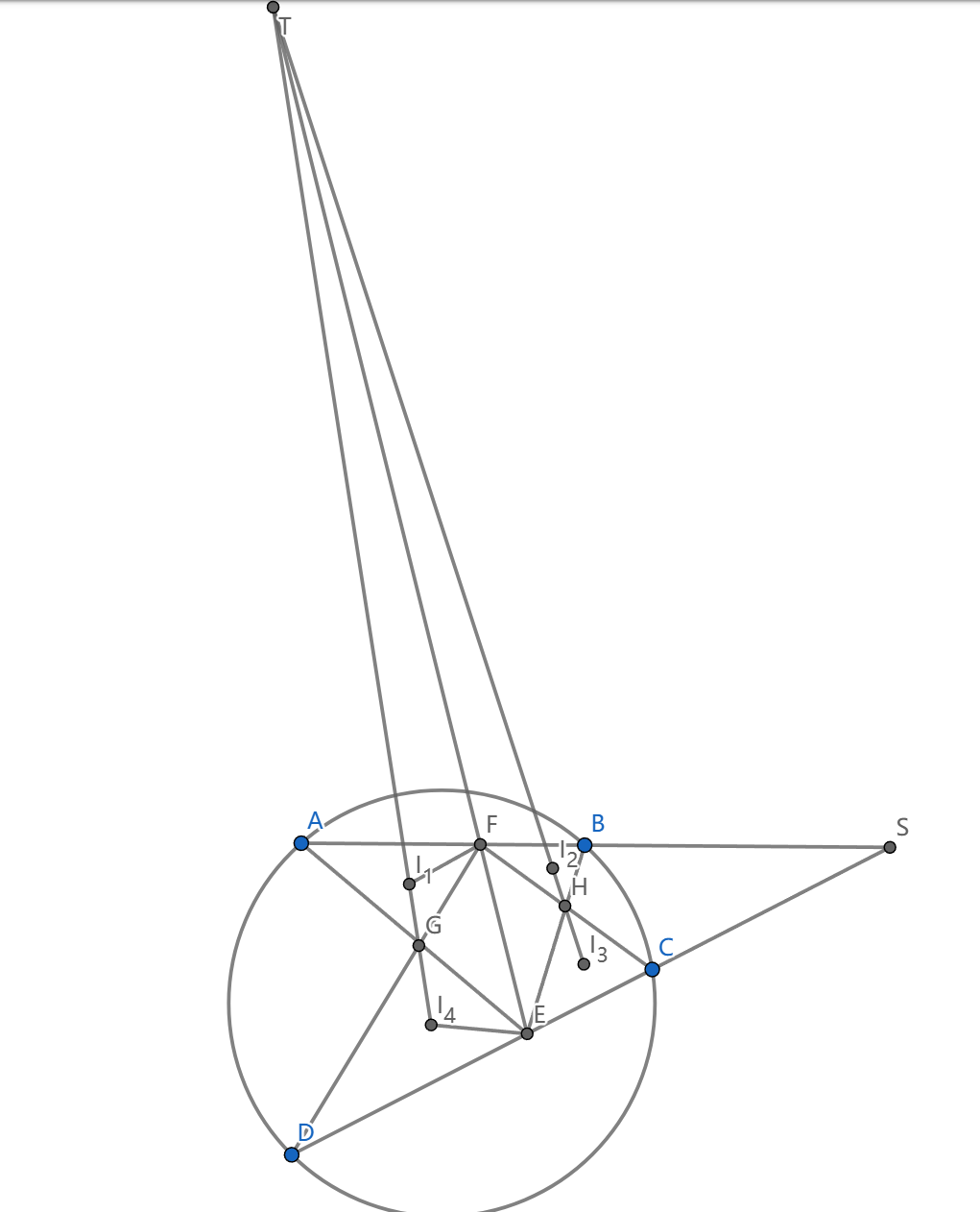 圆内接四边形 \(ABCD\) 中,过 \(A,B\) 的圆与 \(CD\) 切于 \(E\) ,过 \(C,D\) 的圆与 \(AB\) 切于 \(F\) ,\(G=AE\cap DF,H=BE\cap CF\) ,求证: \(\triangle AGF,BHG,CHE,DGE\) 的内心共圆。