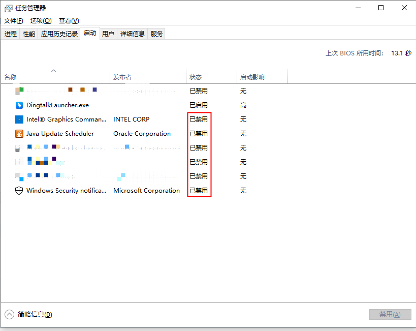 (2)将不需要开机启动的项目禁用,可以加速开机