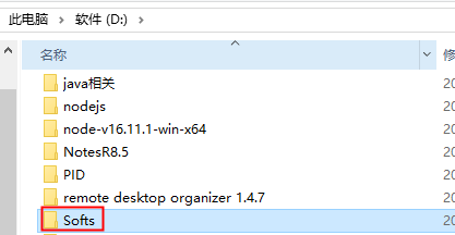 建议在其他盘符,例如 D 盘建立一个 【Softs文件夹】专门用来安装各种软件,并在Softs文件夹内部再次进行区分: