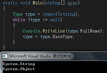 C#中的string是System.String的别名,继承与System.Object。我们可以通过下面的代码查看类型的继承关系。