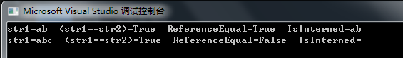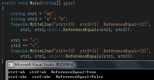 static void Main(string[] args) { string str1 = "ab"; string str2 = "a" + "b"; Console.WriteLine("str1={0} (str1==str2)={1} ReferenceEqual={2} IsInterned={3}", str1, str1==str2, object.ReferenceEquals(str1, str2), string.IsInterned(str1)); str1 += "c"; str2 += "c"; Console.WriteLine("str1={0} (str1==str2)={1} ReferenceEqual={2} IsInterned={3}", str1, str1==str2, object.ReferenceEquals(str1, str2), string.IsInterned(str1)); }