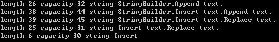 StringBuilder sb = new StringBuilder("StringBuilder."); sb.Append("Append text."); Console.WriteLine("length={0} capacity={1} string={2}",sb.Length, sb.Capacity, sb.ToString()); sb.Insert("StringBuilder.".Length, "Insert text."); Console.WriteLine("length={0} capacity={1} string={2}", sb.Length, sb.Capacity, sb.ToString()); sb.Replace("Append text.", "Replace text."); Console.WriteLine("length={0} capacity={1} string={2}", sb.Length, sb.Capacity, sb.ToString()); sb = sb.Remove(0, "StringBuilder.".Length); Console.WriteLine("length={0} capacity={1} string={2}", sb.Length, sb.Capacity, sb.ToString()); sb.Length = 6; Console.WriteLine("length={0} capacity={1} string={2}", sb.Length, sb.Capacity, sb.ToString());