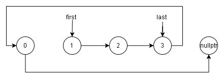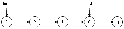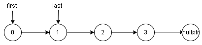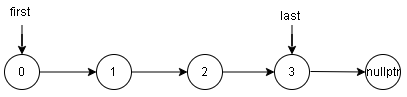 使用指针 \(first\) 指向头结点,指针 \(last\) 指向尾结点: