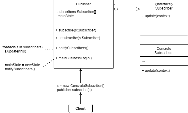 - 声明发布者接口并定义一些接口来在列表中添加和删除订阅对象。发布者必须仅通过订阅者接口与他们交互。