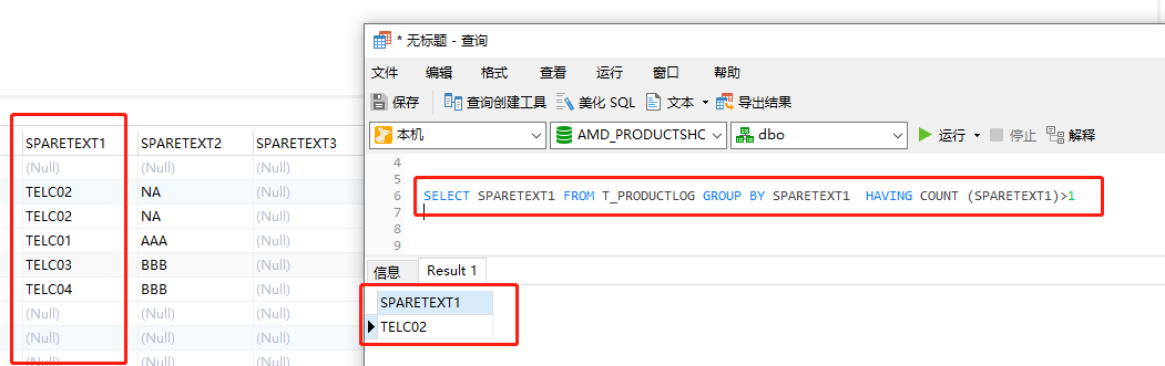 -- SQL语法:SELECT 查重的列名 FROM 表名 GROUP BY 查重的列名 HAVING COUNT (查重的列名)>1 例:SELECT SPARETEXT1 FROM T_PRODUCTLOG GROUP BY SPARETEXT1 HAVING COUNT (SPARETEXT1)>1 -- 查询相应重复数据的所有列 SELECT * FROM T_PRODUCTLOG WHERE SPARETEXT1 IN (SELECT SPARETEXT1 FROM T_PRODUCTLOG GROUP BY SPARETEXT1 HAVING COUNT (SPARETEXT1)>1)