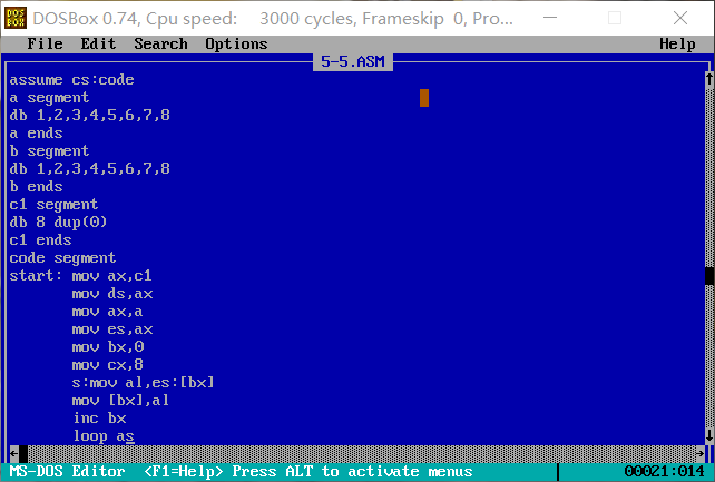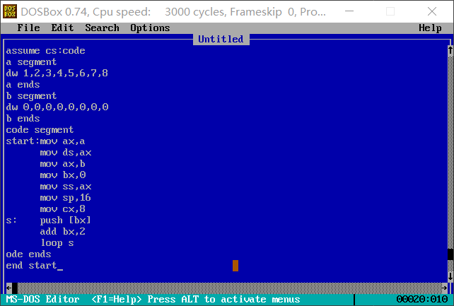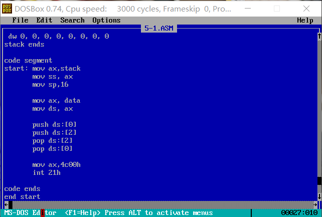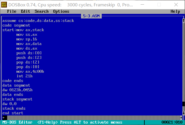 3. 程序加载后,code段的段地址为X,则data段的段地址为: X-2 ,stack段的段地址为: X-1