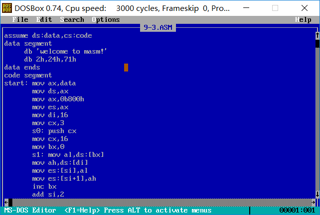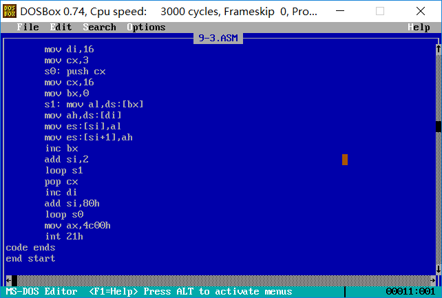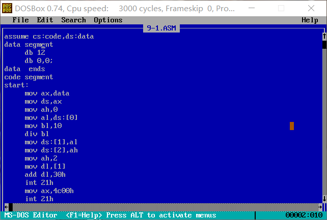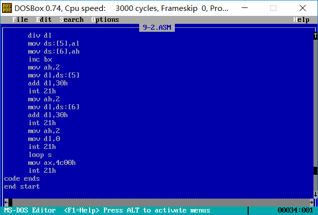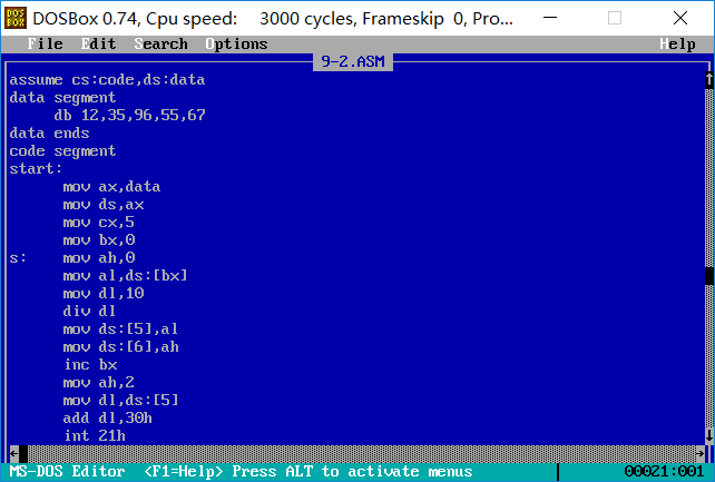 1. 补全程序t1.asm,完成在屏幕上输出内存单元中的十进制两位数