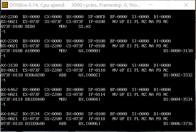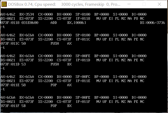 在使用t 命令进行调试时,会产生中断。为了保护现场,cpu则会将标志寄存器进栈,再把当前CS的值进栈,最后将IP的值进栈。